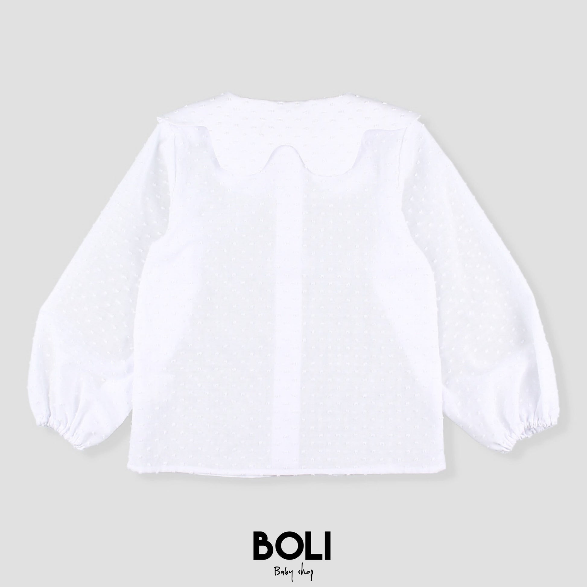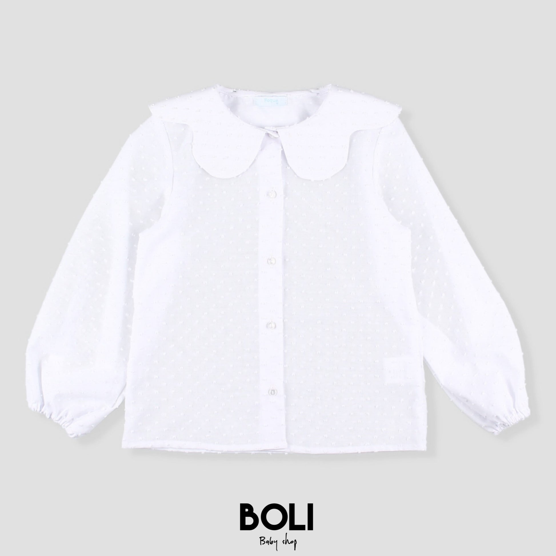 Blusa para niña confeccionada en tejido plumeti blanco de manga larga, cuello volantes y valencienne, botonadura en el frente.