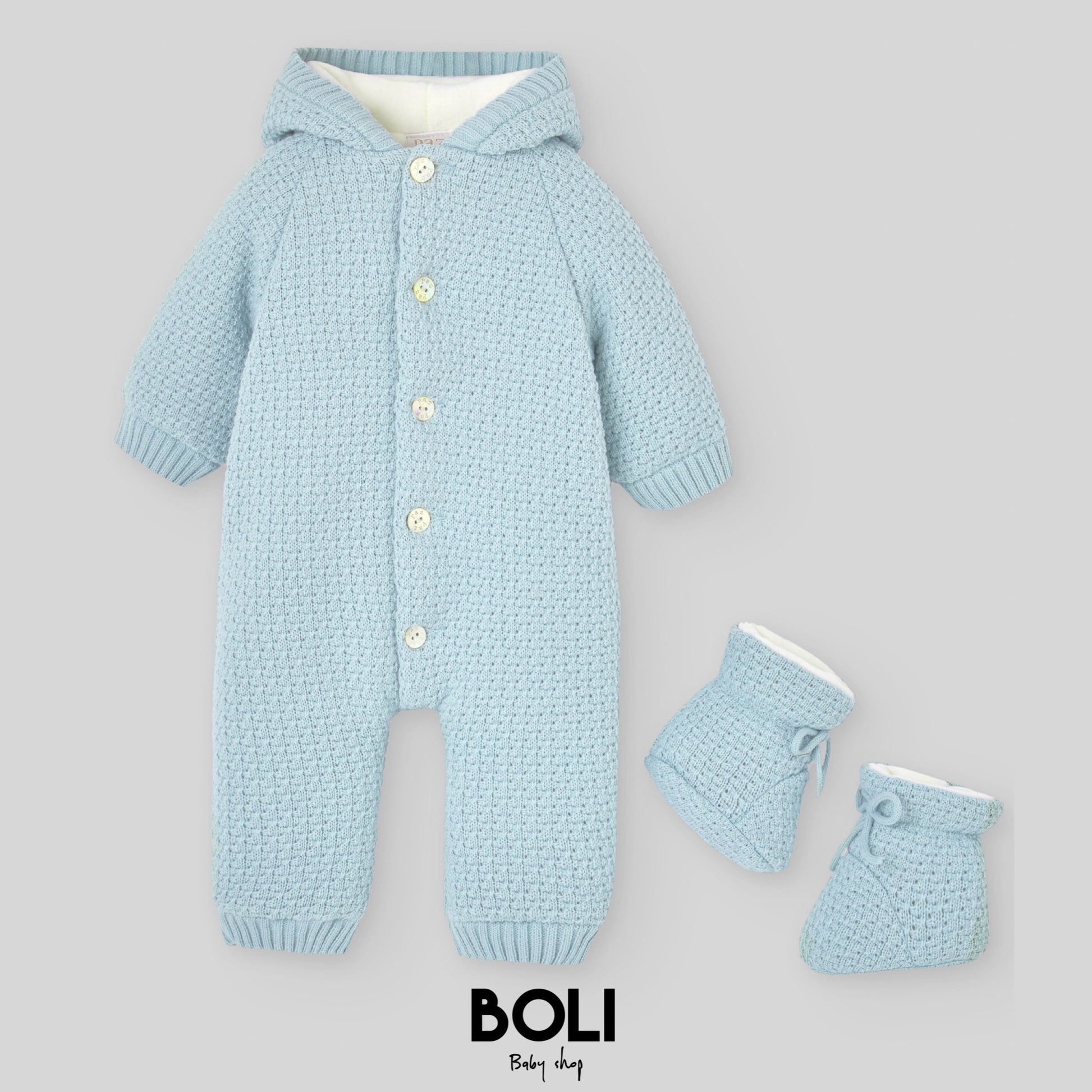 Buzo con pie para bebé en punto de algodón con capucha. Forro con tejido con algodón. Manga larga. Capucha en pico. Cierre con botones.