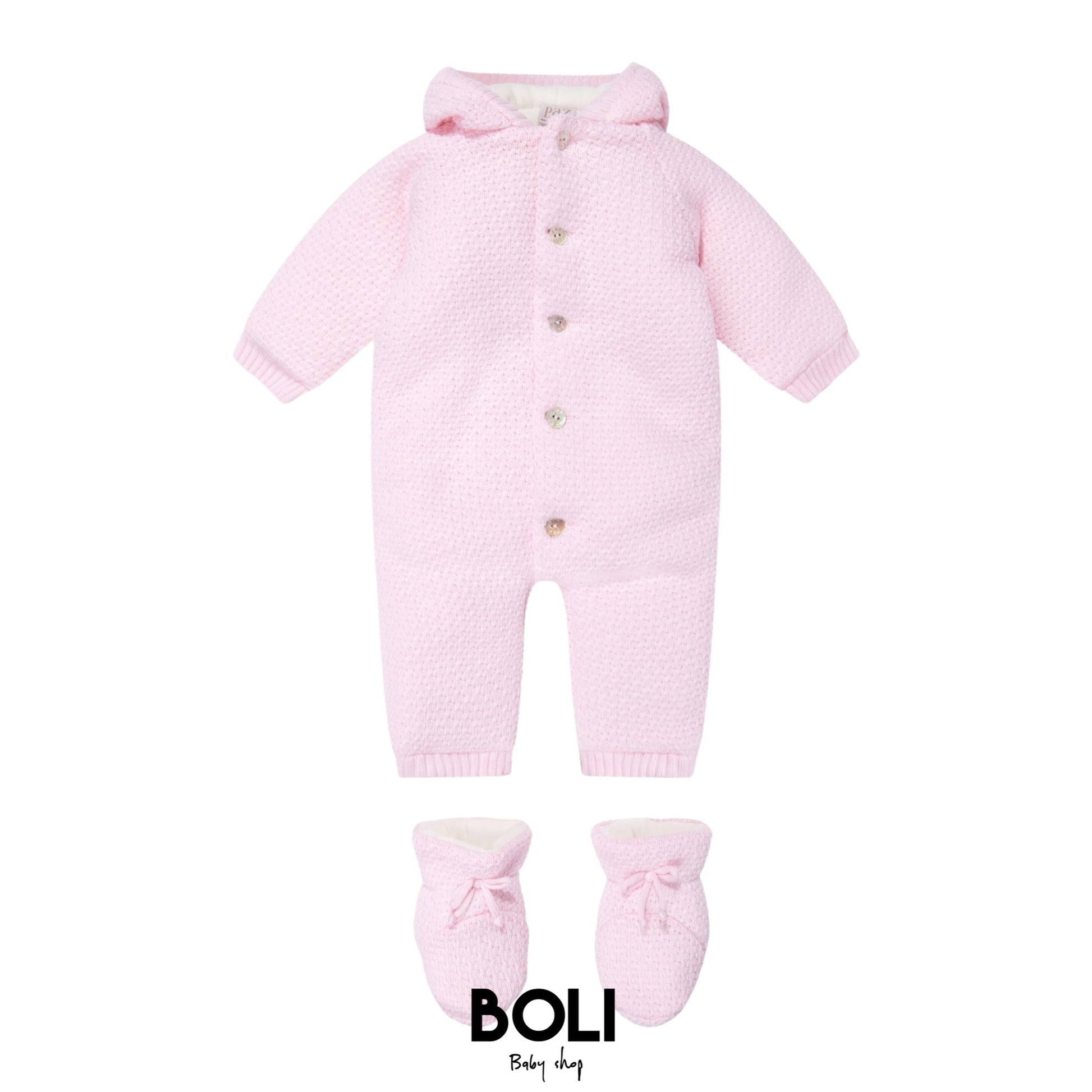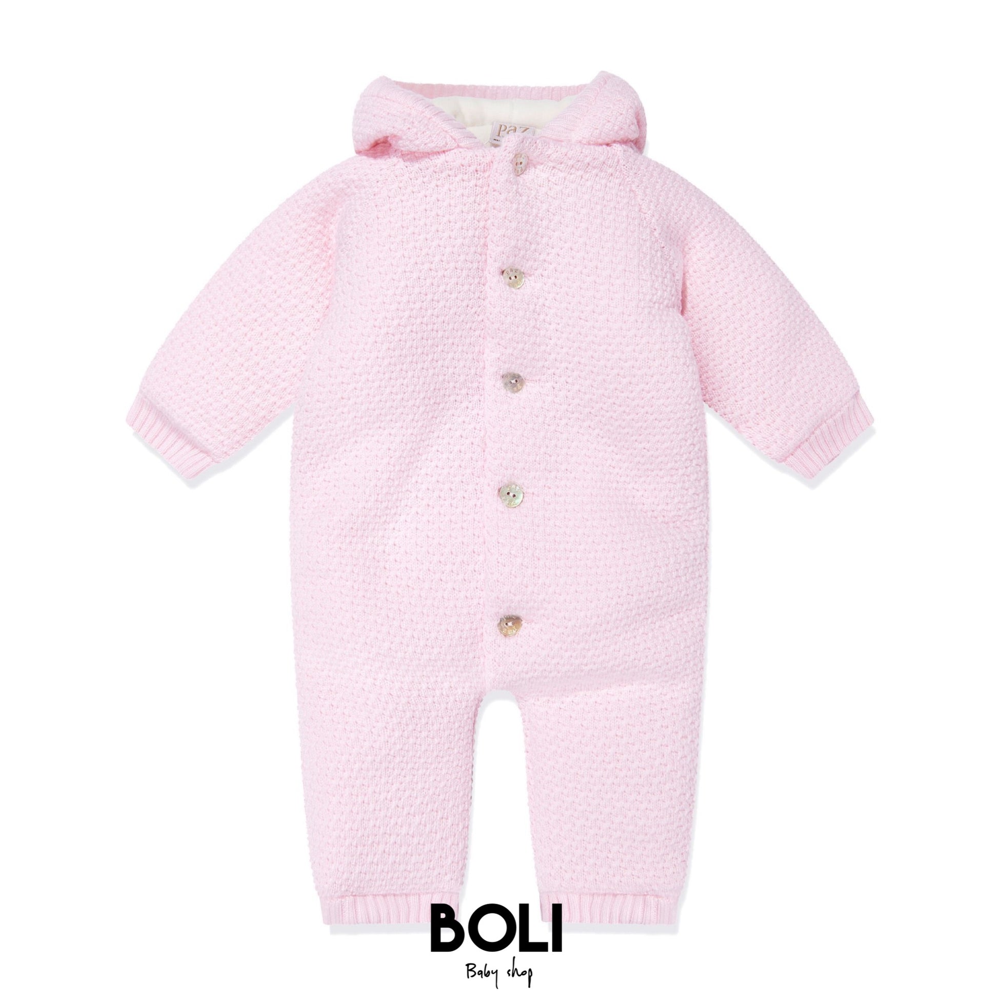 Buzo con pie para bebé en punto de algodón con capucha. Forro con tejido con algodón. Manga larga. Capucha en pico. Cierre con botones.