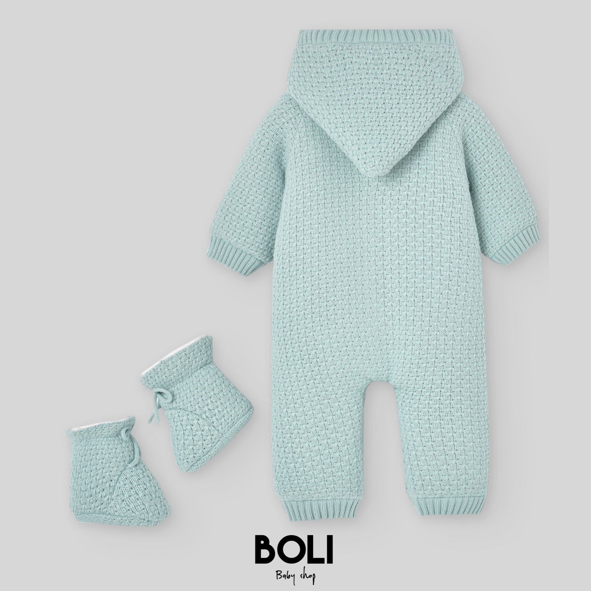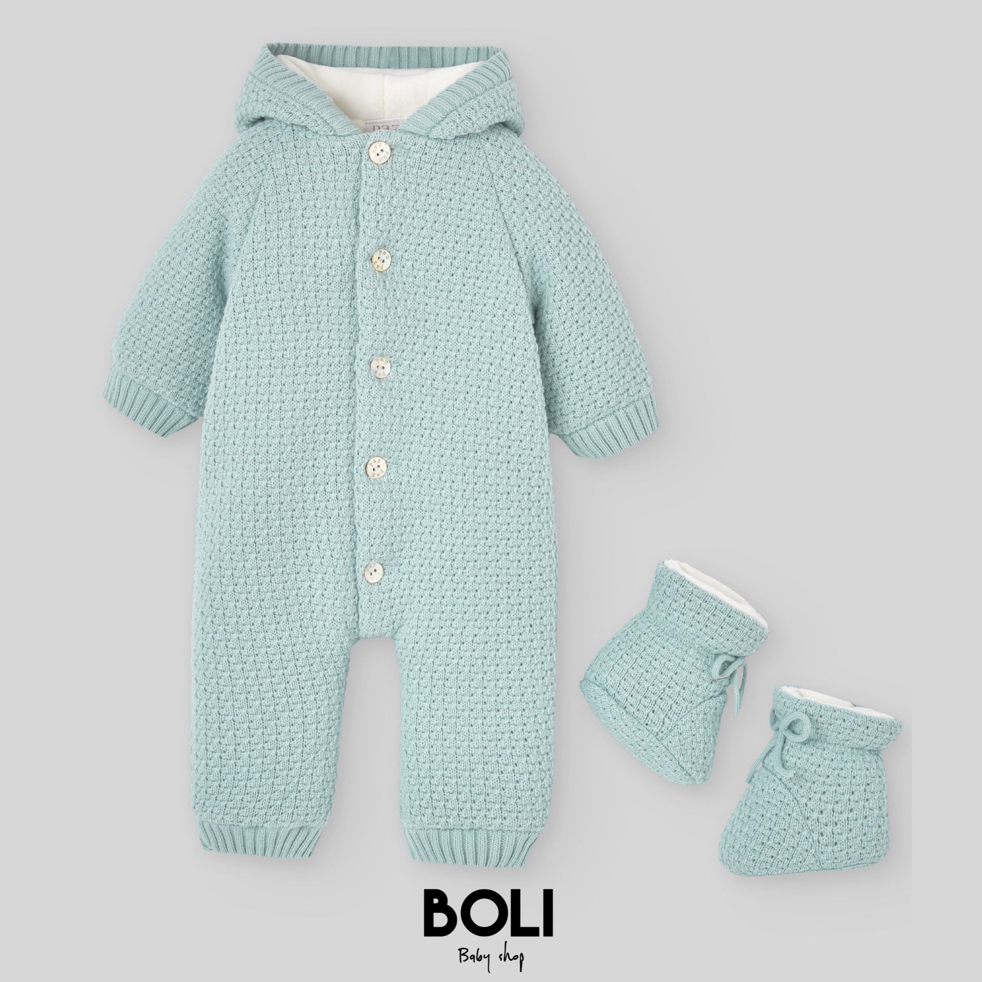 Buzo con pie para bebé en punto de algodón con capucha. Forro con tejido con algodón. Manga larga. Capucha en pico. Cierre con botones.