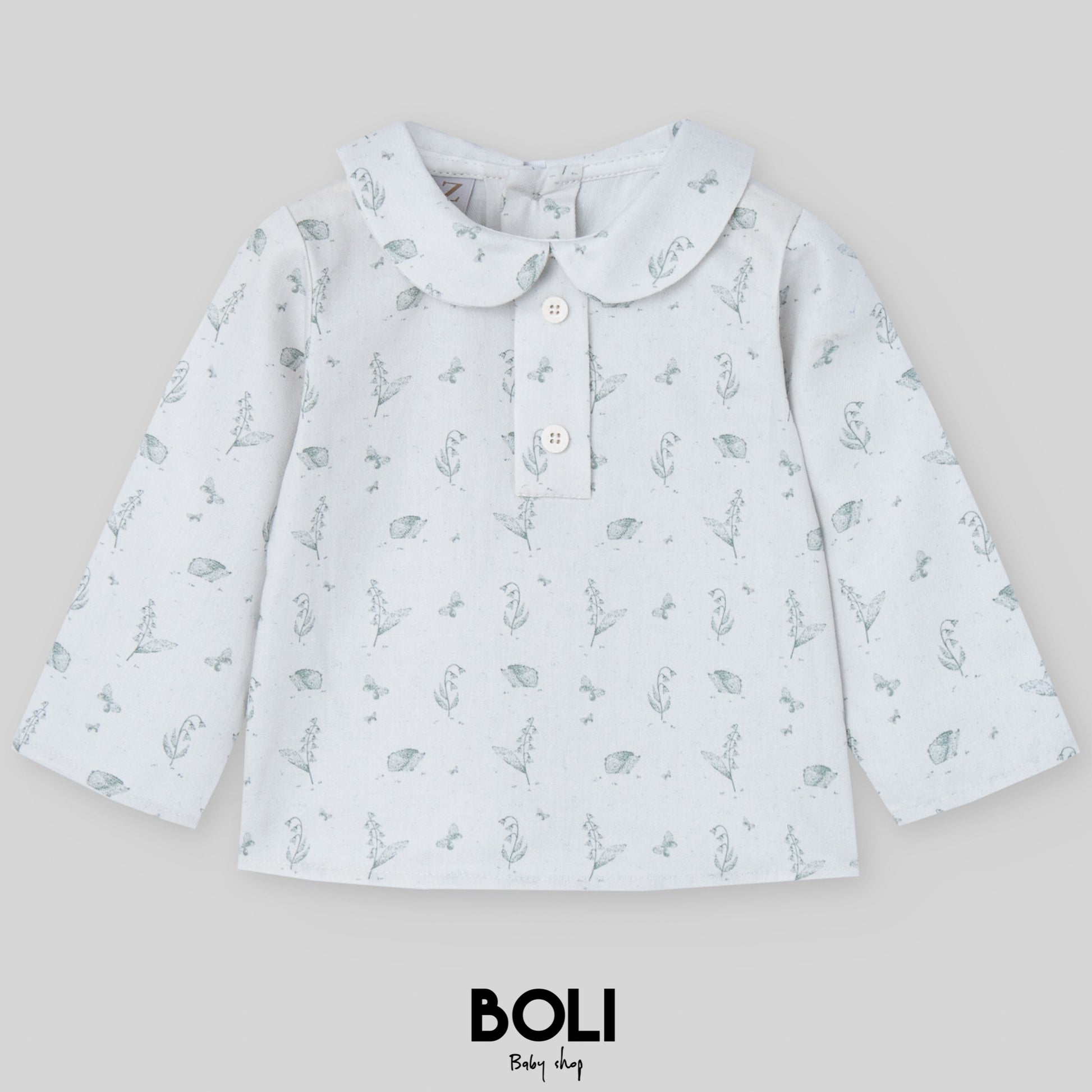 Blusa con estampado. Cuello redondo Peter Pan. Cierre trasero con botones.