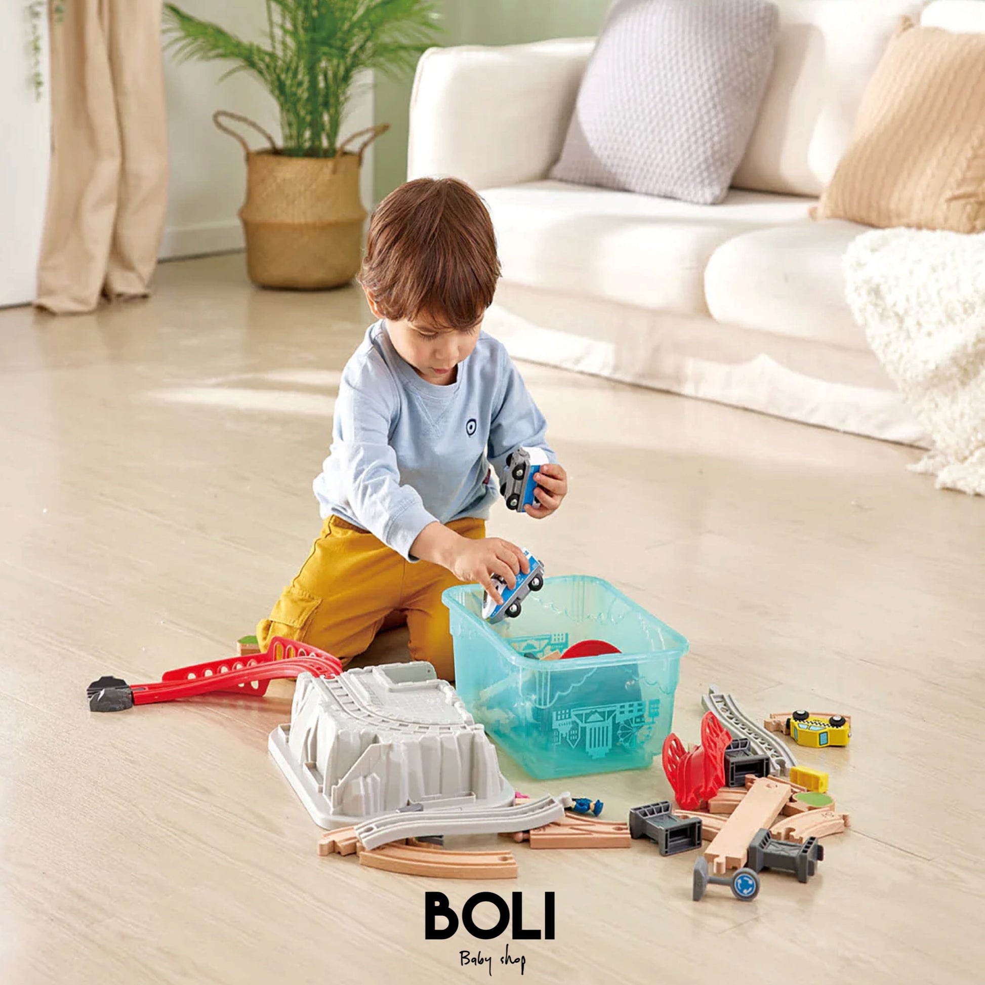 ¡Emprende una divertida aventura en tren por la ciudad! Este juego de cubos portátil está lleno de accesorios, como árboles, señales y vehículos. Encontrarás este maravilloso juego en una caja de almacenamiento que forma parte del escenario.