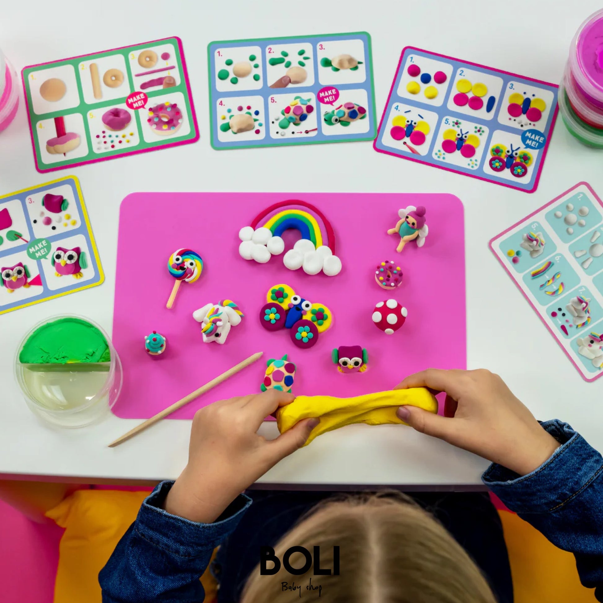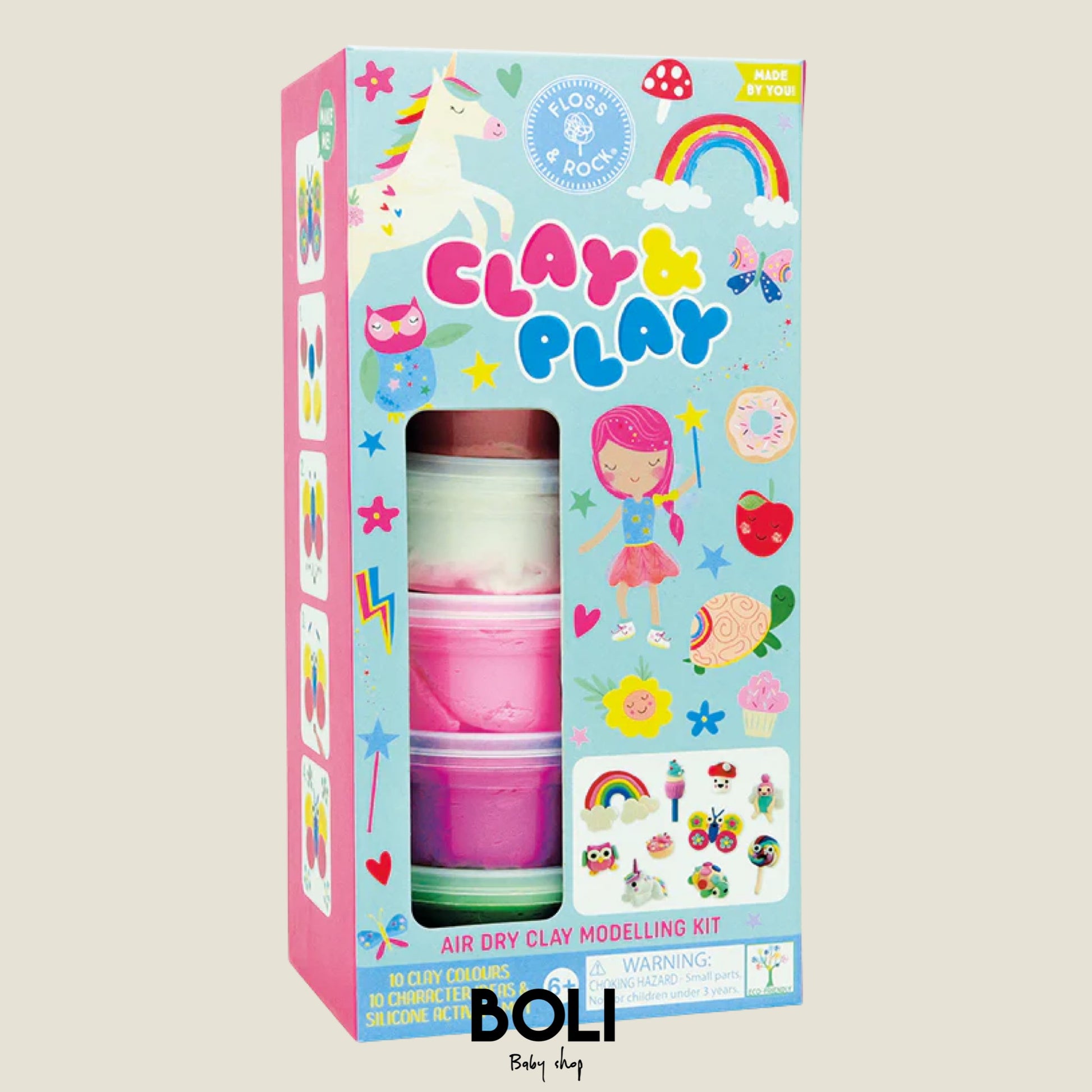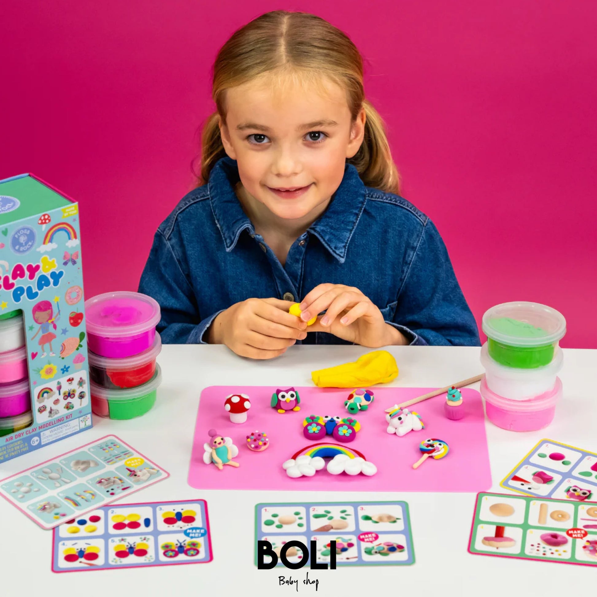 ¡Conviértete en un maestro escultor y genio creativo con Clay & Play! Cada juego viene con 6 macetas de 10 colores diferentes de arcilla seca al aire, 5 tarjetas de instrucciones de doble cara (que te guían paso a paso a través del proceso creativo), una alfombra de silicona de colores brillantes y una práctica herramienta de lápiz de madera para la elaboración.