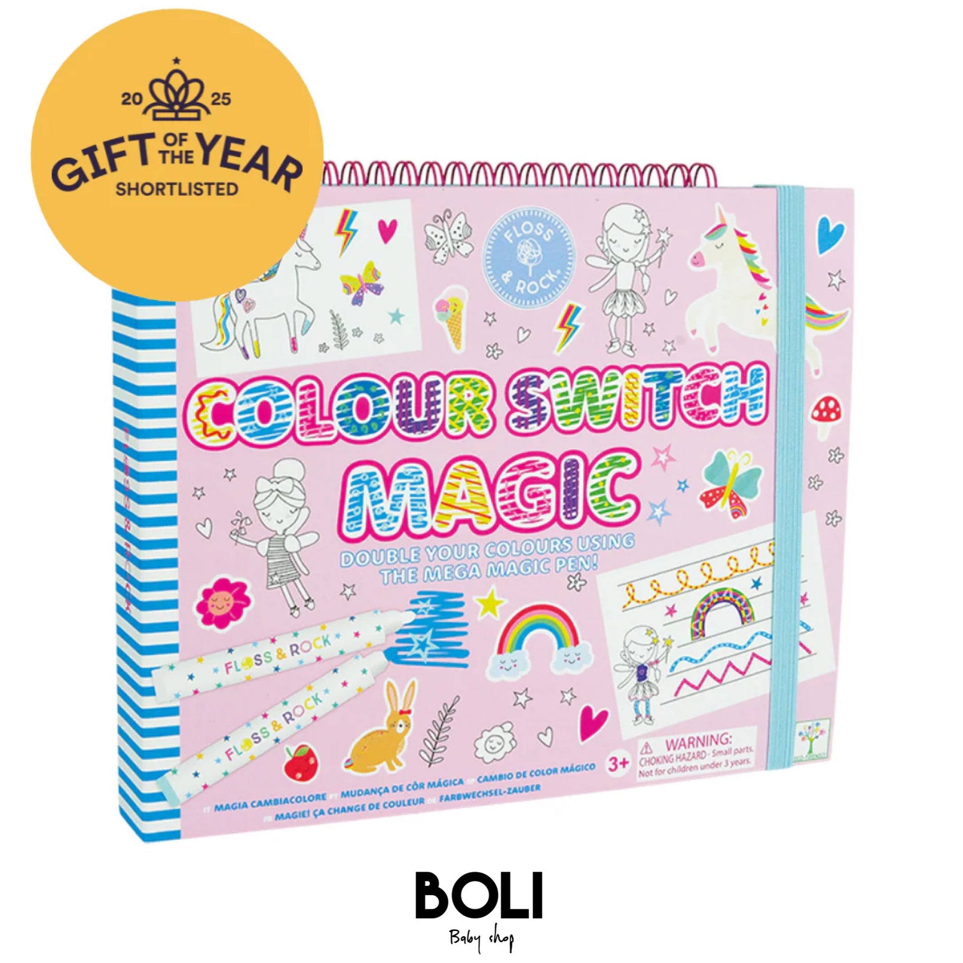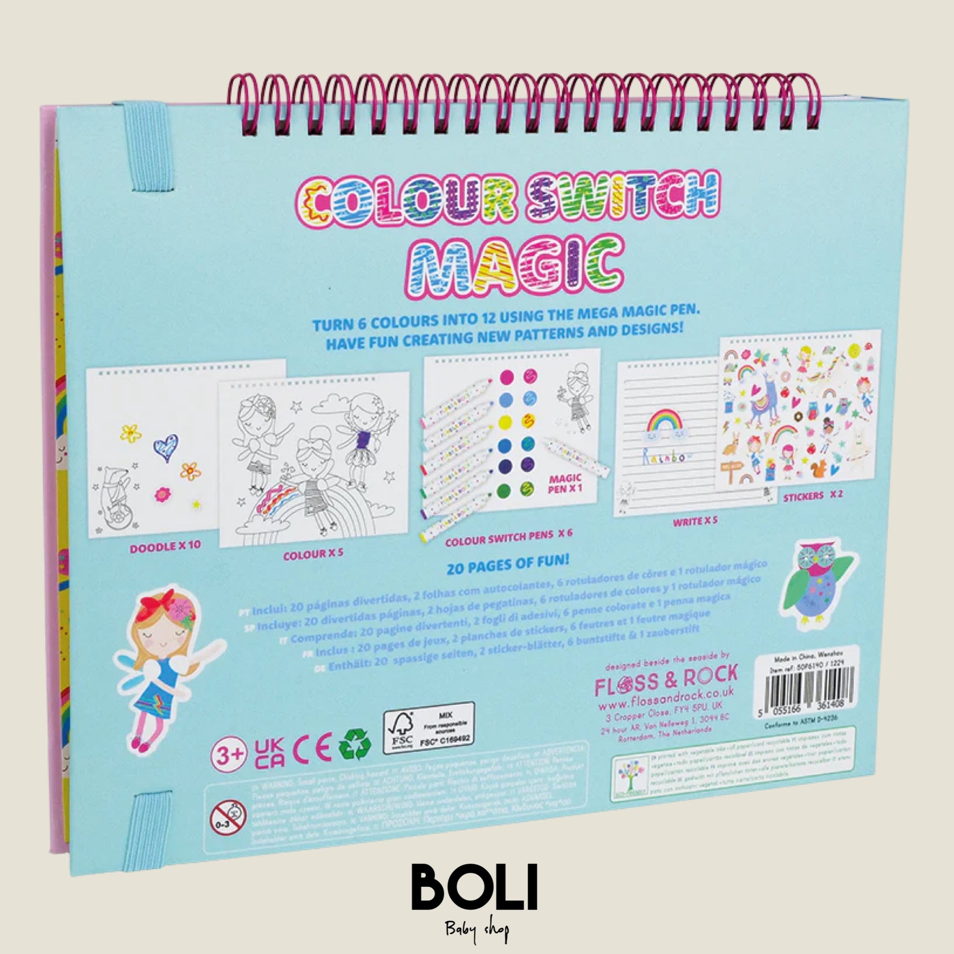 ¡Duplica la diversión con Color Switch Magic! El bolígrafo blanco mágico convierte 6 colores en 12, lo que resulta en horas de diversión creando patrones y más. Cada bloc contiene 10 páginas de garabatos, 5 páginas para colorear, 6 bolígrafos de cambio de color, 1 bolígrafo mágico, 5 páginas rayadas para escribir y 2 páginas de pegatinas