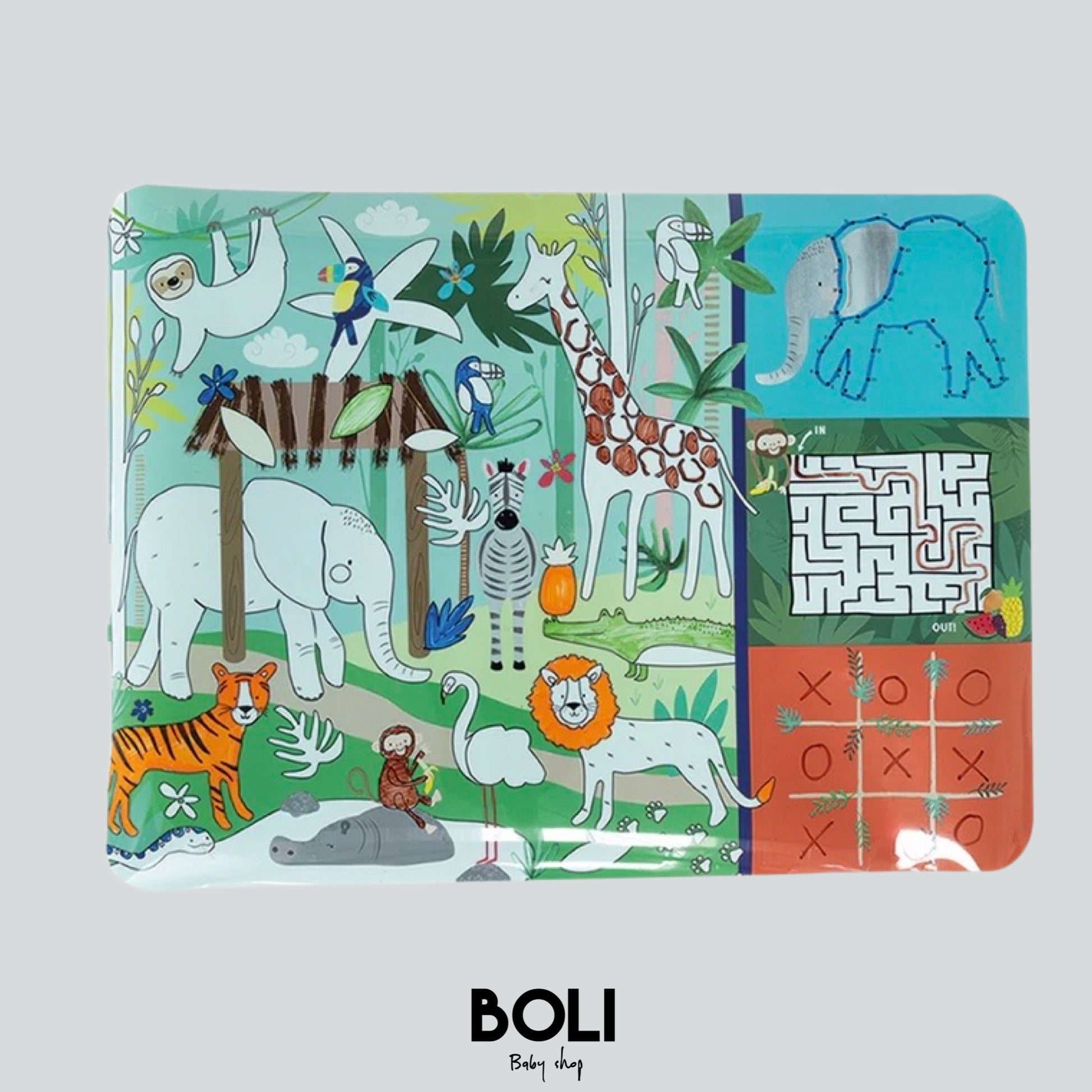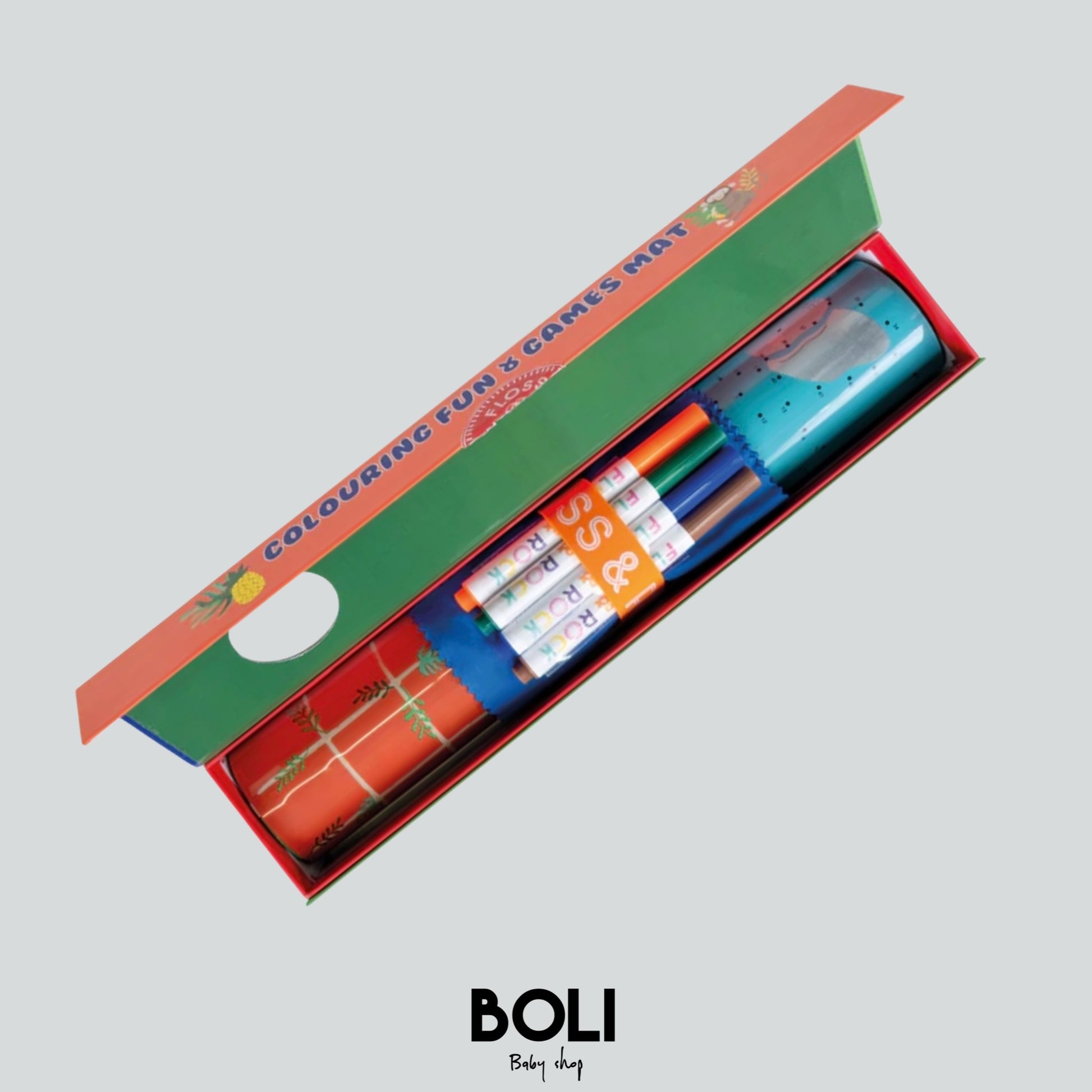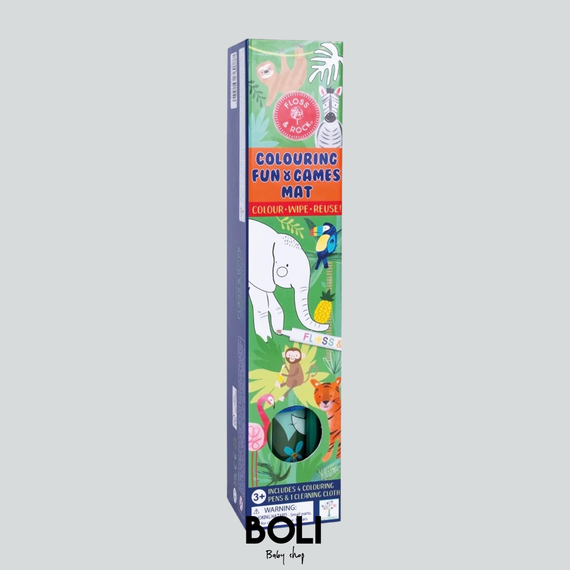 COLOR. LIMPIAR. REUTILIZAR. Nuestra nueva alfombra Coloring Fun & Games es una brillante actividad de juego múltiple para viajar. Simplemente despliegue la alfombra para colorear, punto a punto, un laberinto y juegos de "tic tac toe". Cuando termine, limpie, enróllelo y use la banda de sujeción para empacar la alfombra en la práctica caja para usarla una y otra vez.