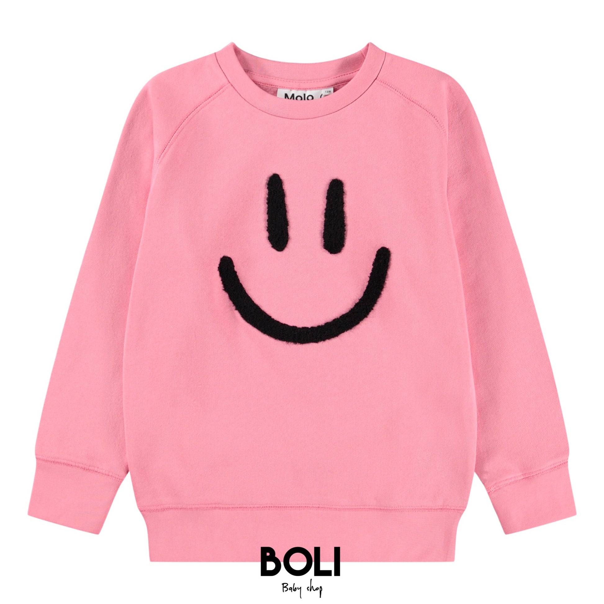Sudadera rosa hecha de algodón orgánico suave con mangas raglán, bordes acanalados alrededor del cuello, las mangas y la cintura. La sudadera tiene un ajuste holgado con un bordado negro y suave en la parte delantera.