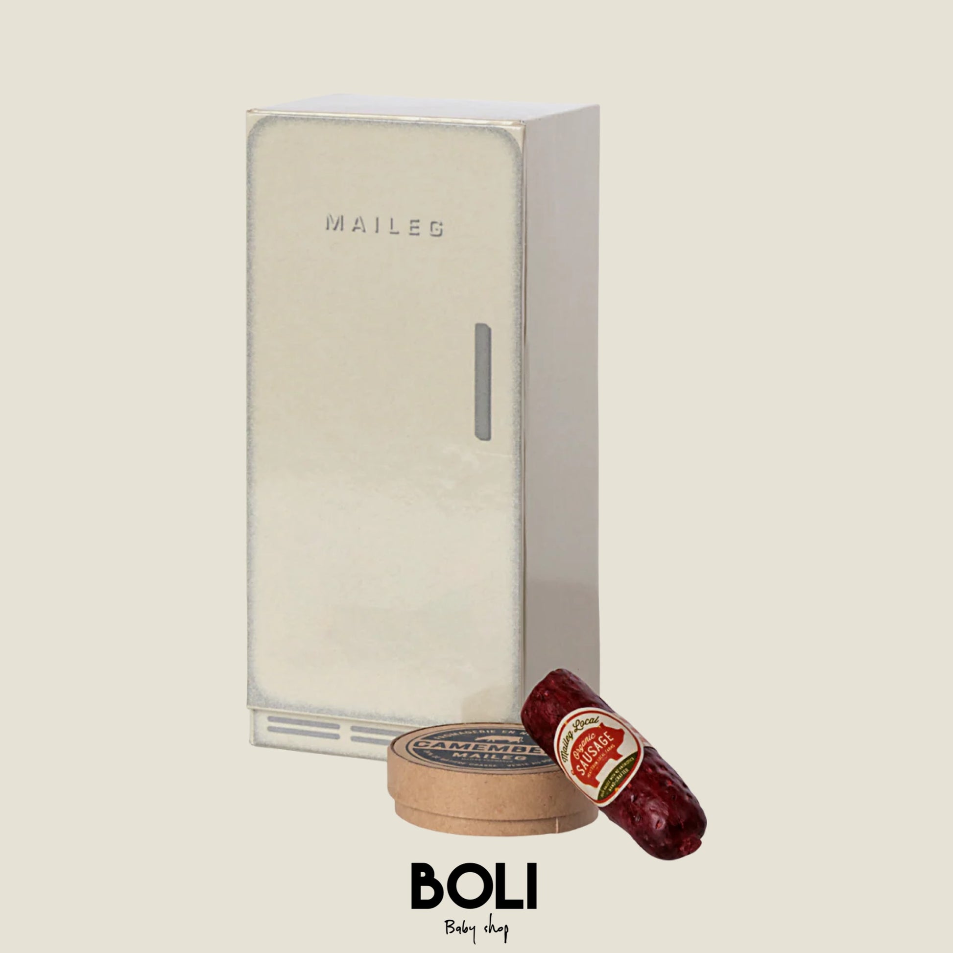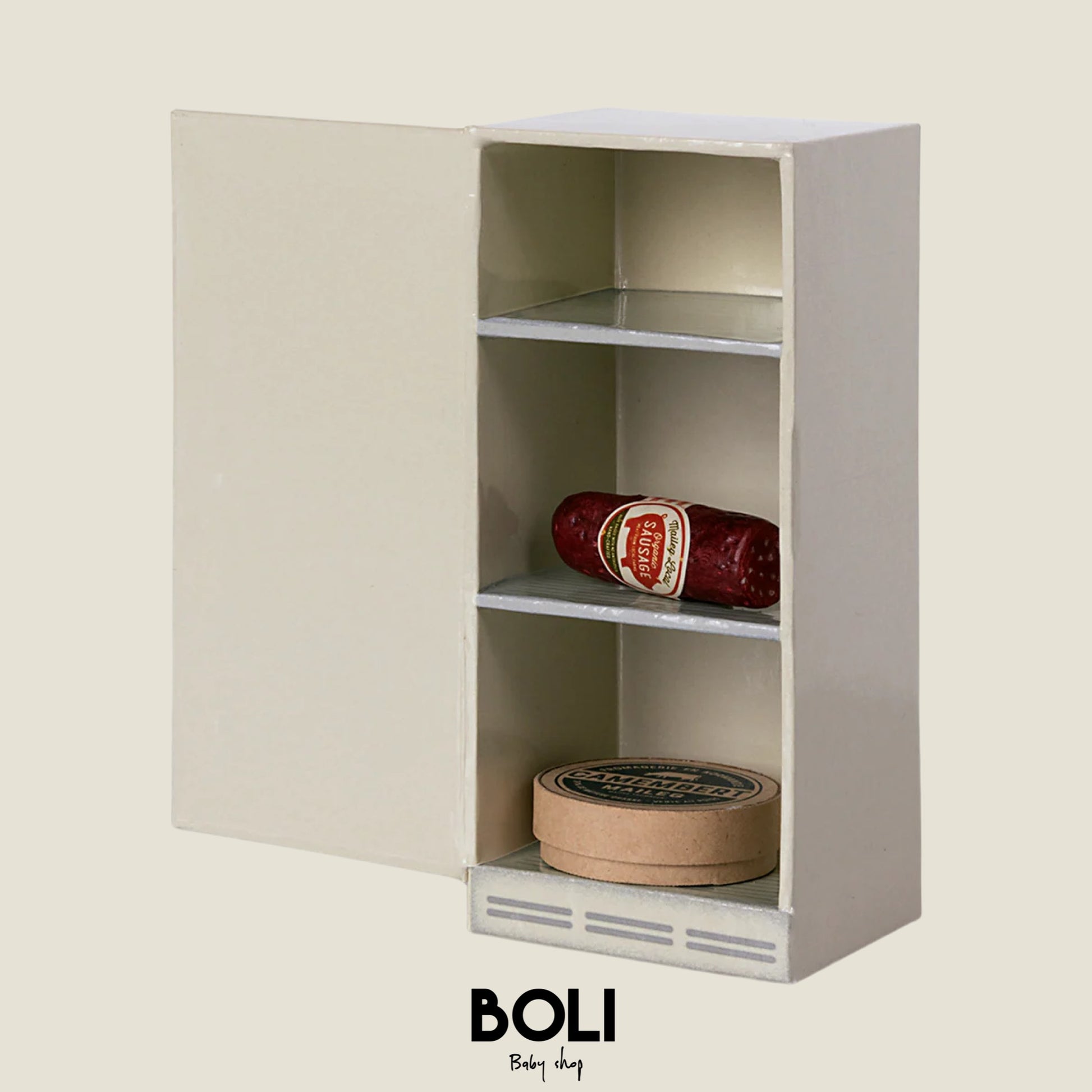 El lugar perfecto para guardar tus comestibles para que se mantengan frescos y fríos. Dentro de la nevera, encuentras una pequeña salchicha y queso. La nevera está hecha de cartón y encaja perfectamente en el castillo del ratón.