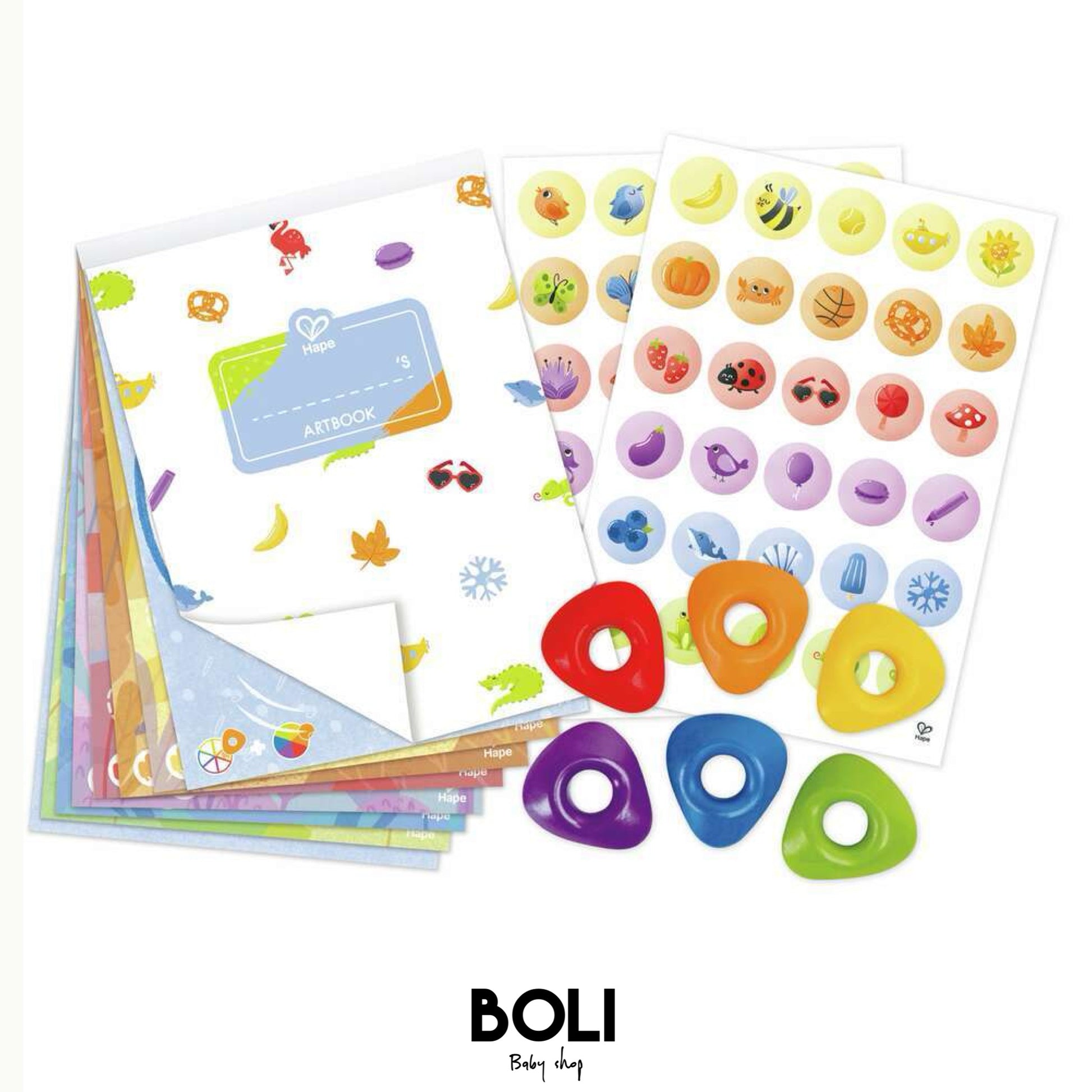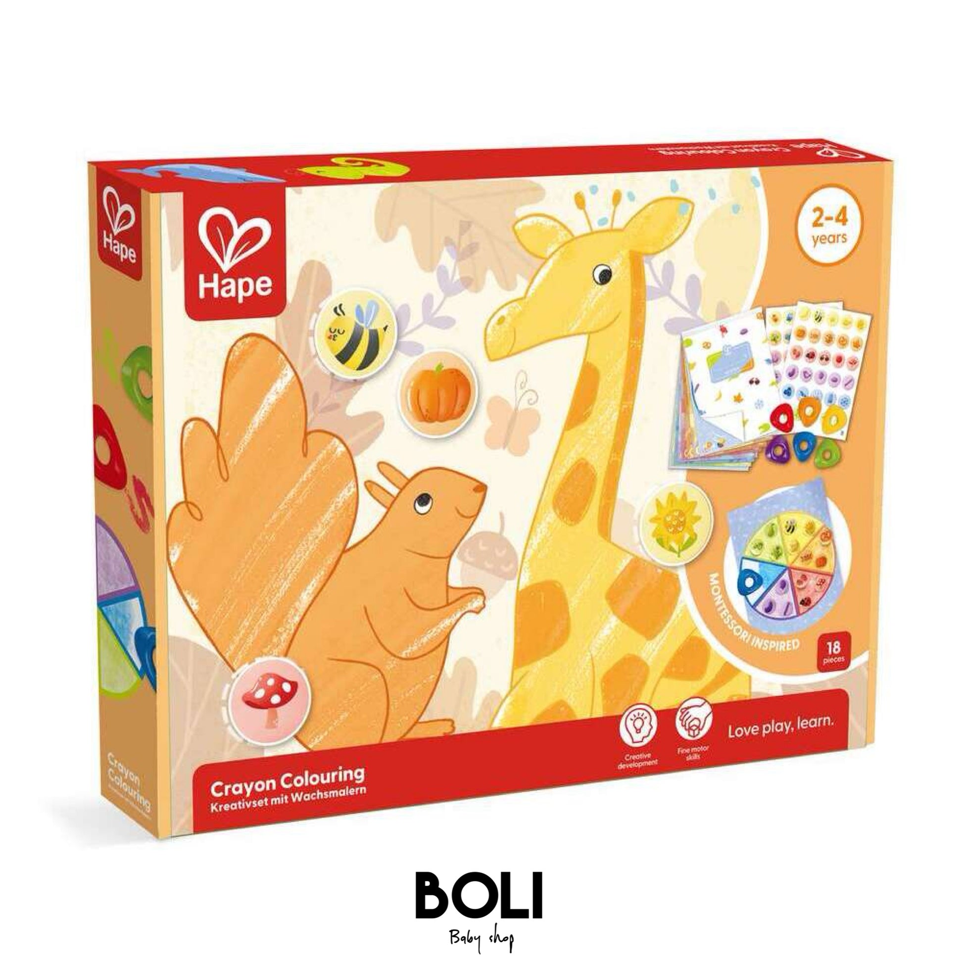 Viene con un álbum de actividades de siete páginas, seis crayones ergonómicos y pegatinas