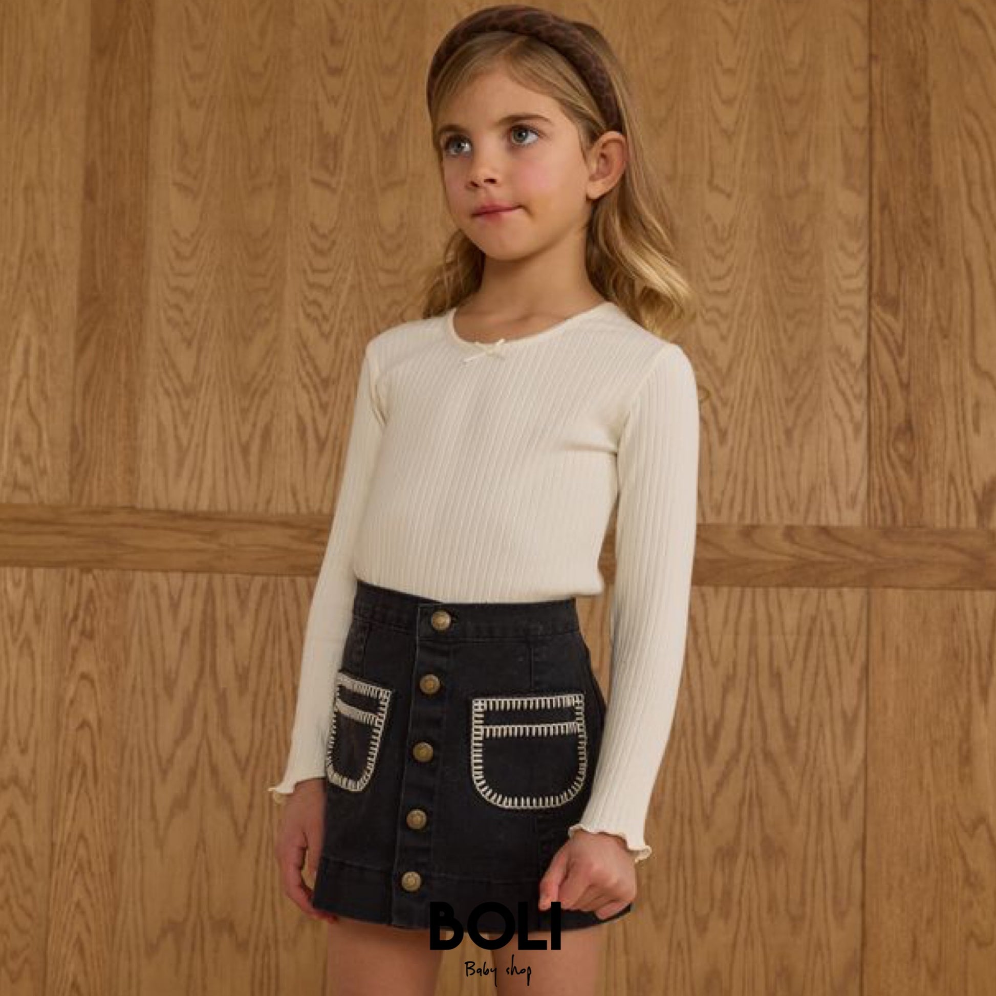 Esta versátil falda de mezclilla canaliza el encanto preppy con botones de latón antiguos y bolsillos de parche delantero acentuados por costuras bordadas de contraste.