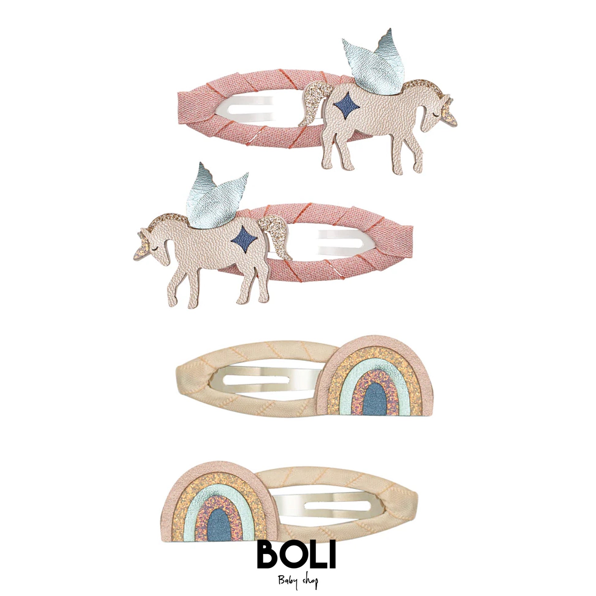 ¡Deja que sus sueños míticos despeguen con este conjunto de clips súper mágico con dos unicornios brillantes y dos estrellas fugaces brillantes!