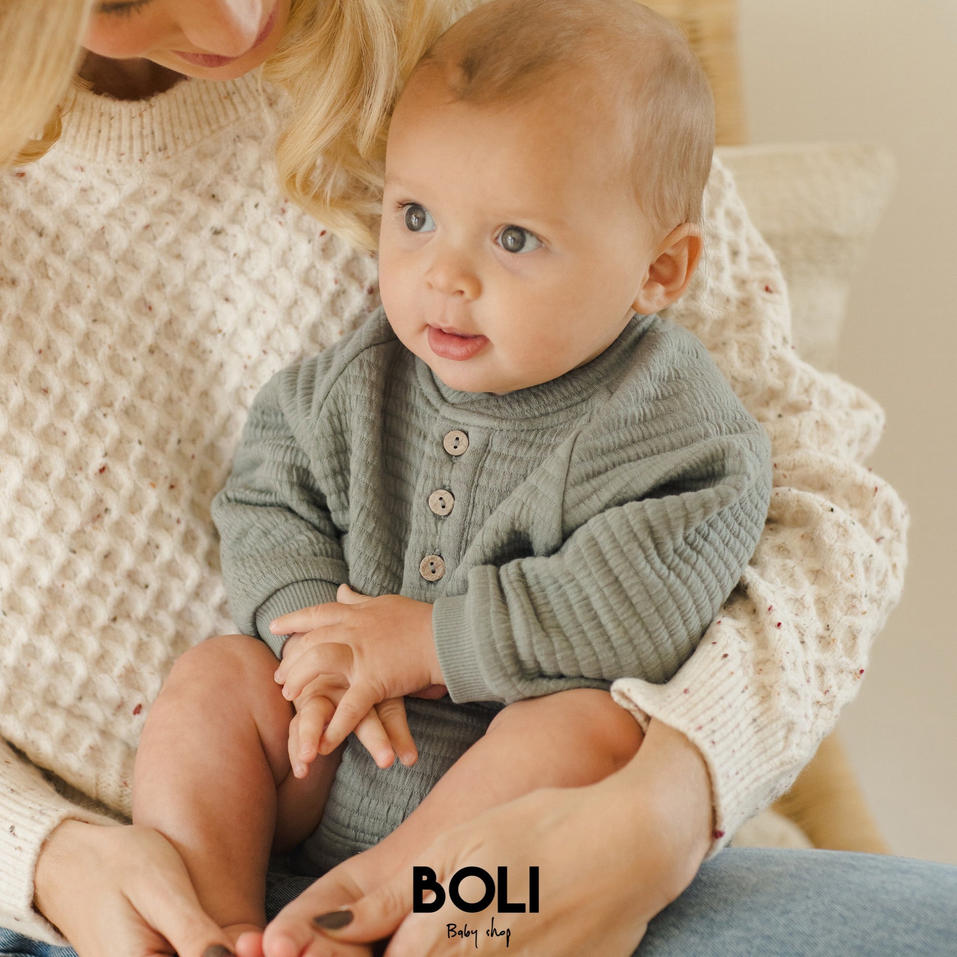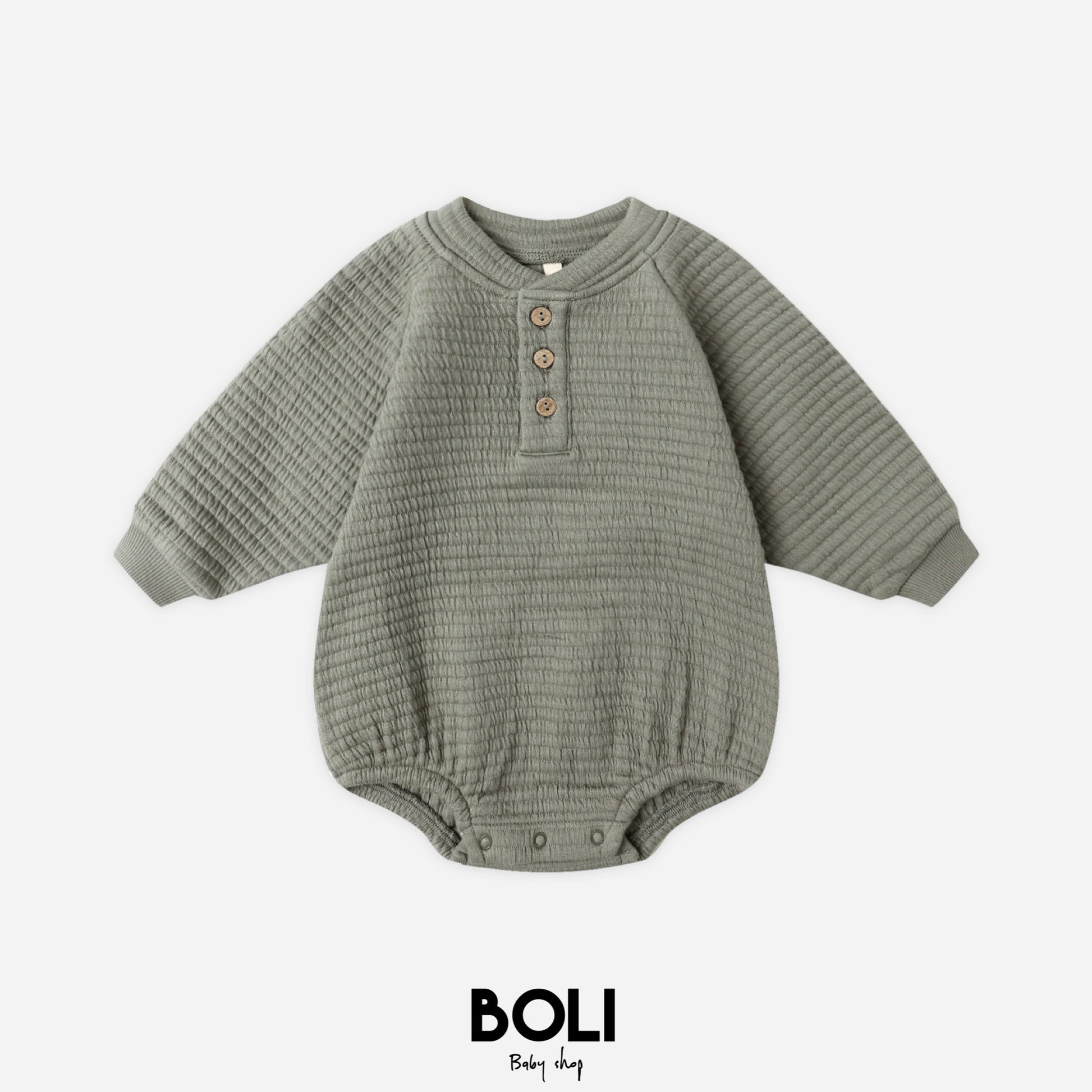 Mameluco tipo burbuja con cuello henley de manga larga confeccionado en tejido acolchado suave y acogedor. Las aberturas elásticas en las piernas, así como los cierres a presión en la parte inferior, garantizan un fácil cambio.