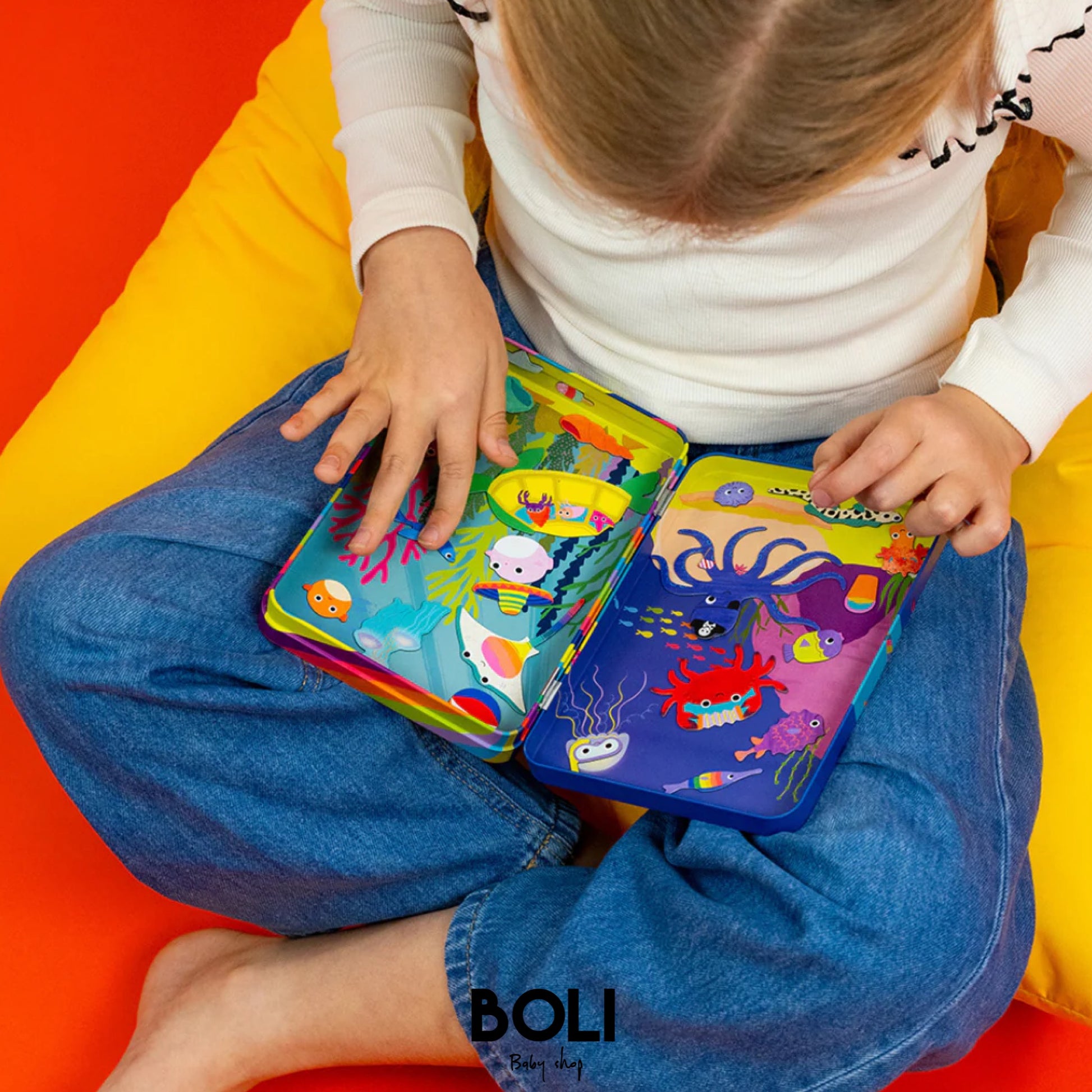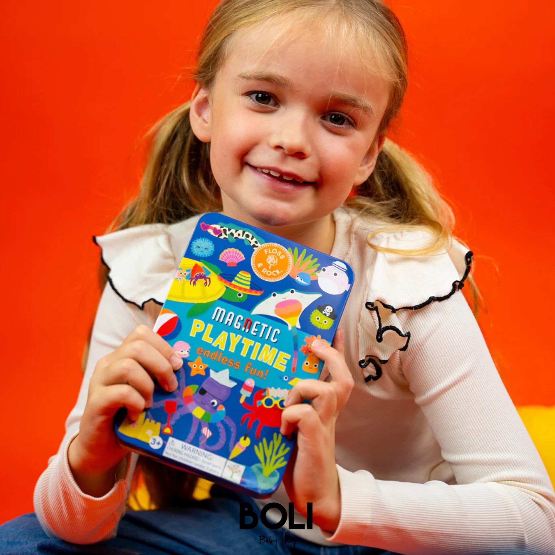 ¡Tiempo de diversión en una práctica lata magnética! Contiene 3 hojas de imanes emergentes para que puedas divertirte pegando más de 50 piezas magnéticas brillantes y divertidas a las 2 escenas divertidas en el interior de tu lata y dejar volar tu imaginación creando imágenes fabulosas con cangrejos geniales, tortugas que se retreen y mucho más. Un regalo perfecto para recoger, impreso con tintas de soja y hecho con materiales reciclados. Cuando termines de jugar, la lata magnética almacena de forma segura todas tus piezas listas para la próxima vez.