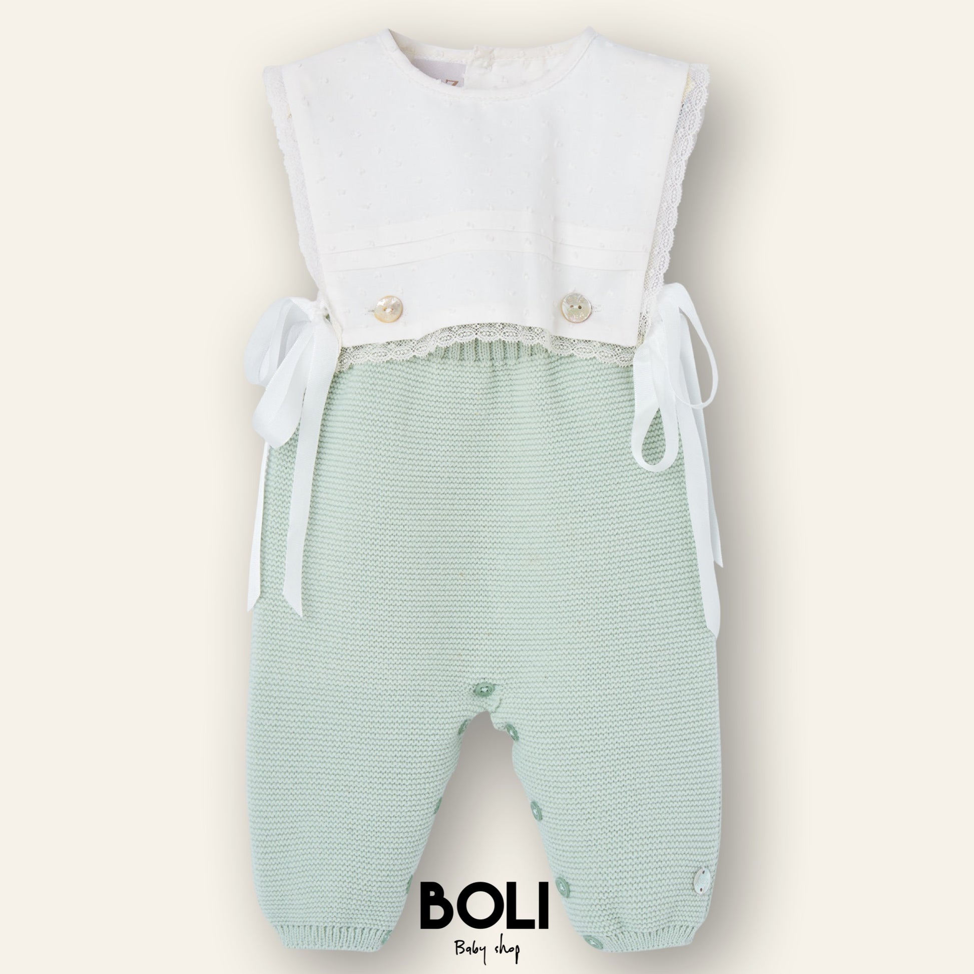 Pelele combinado sin pies, con parte superior en punto y pantalón en tela con estampado delicado. Cuello con volante y detalles de puntilla en el delantero. Cierre trasero y en la entrepierna con corchetes.
