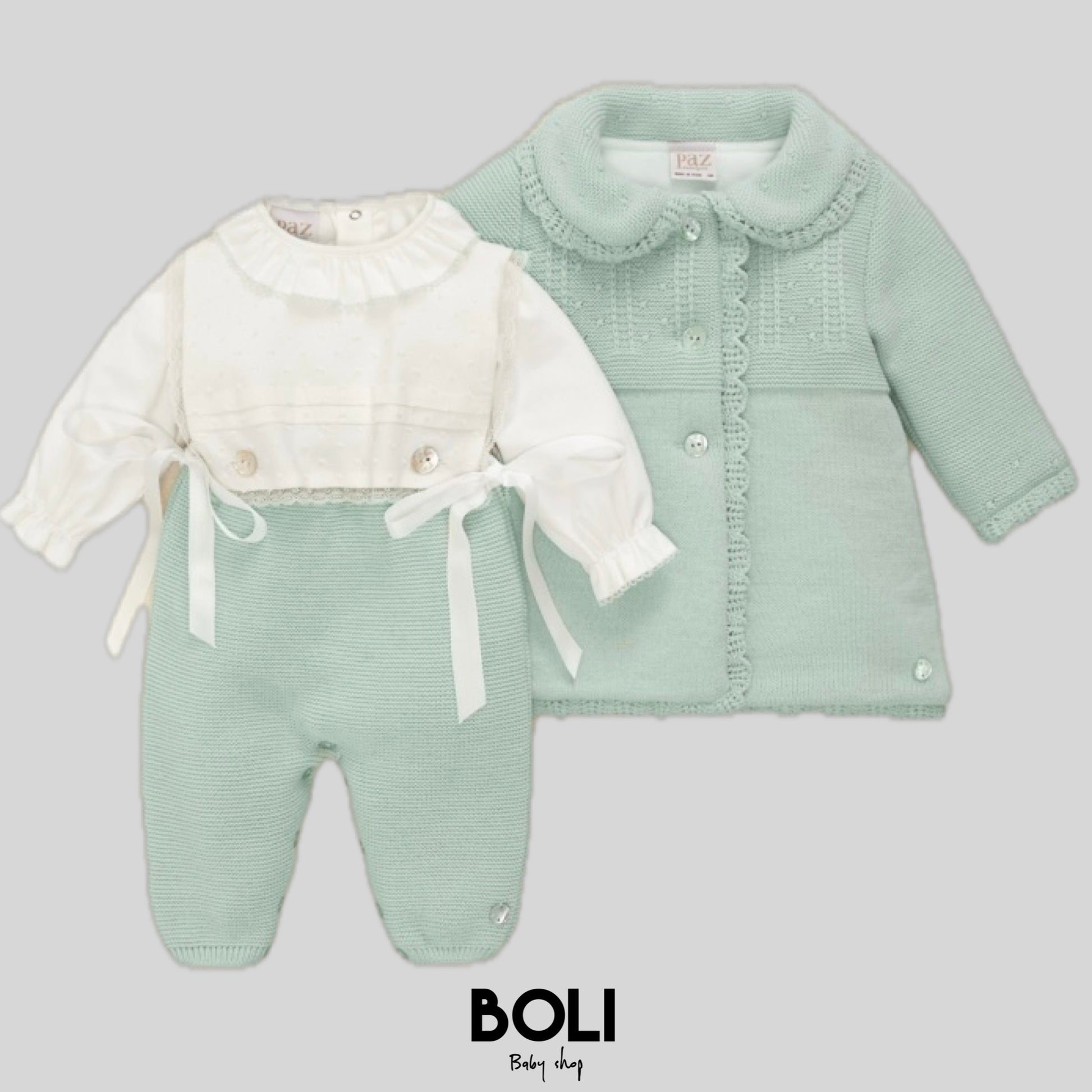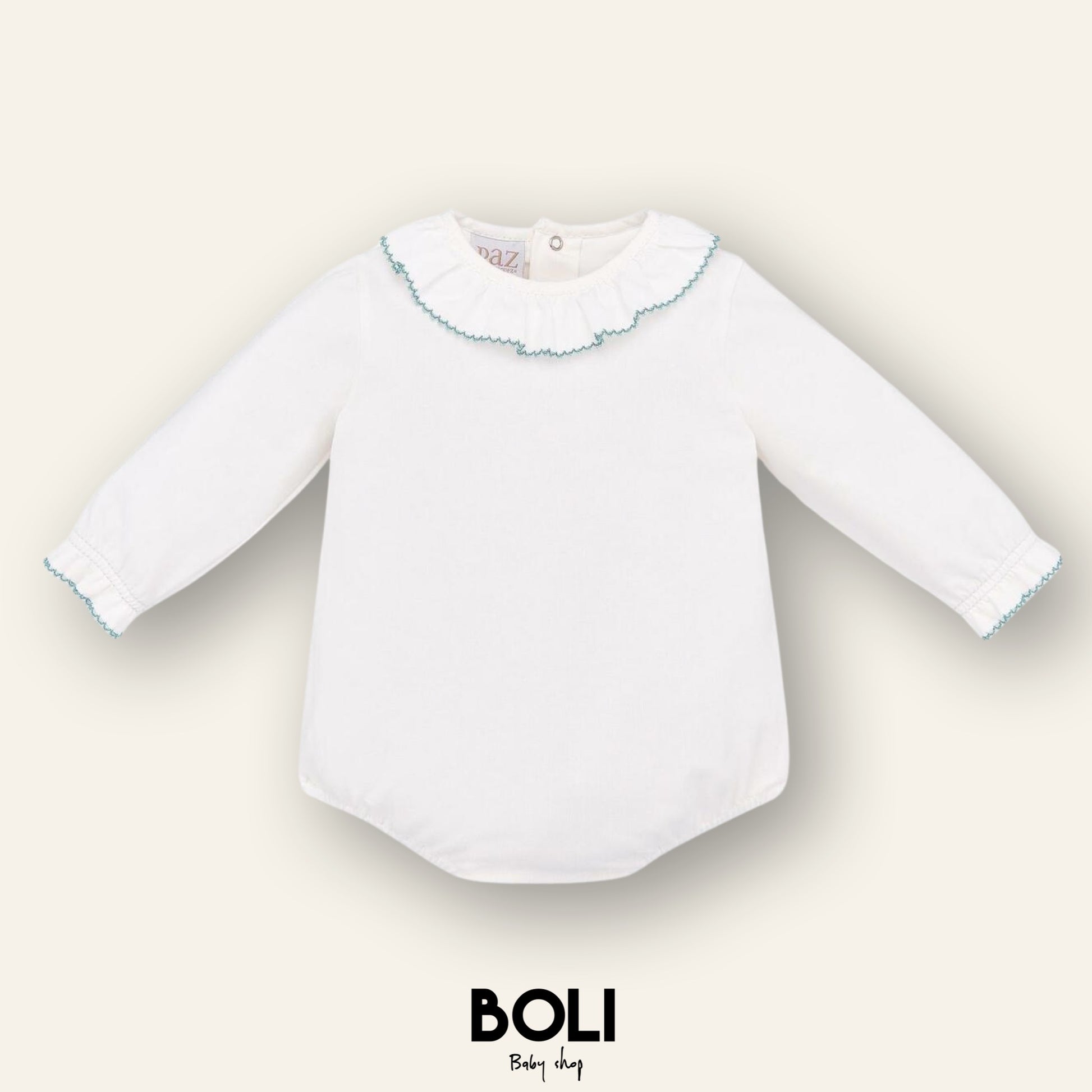 Body de punto de jersey de manga larga con cuello dentado. De estilo clásico y delicado, incorpora botones en la espalda y entrepierna para un cambio cómodo y rápido.