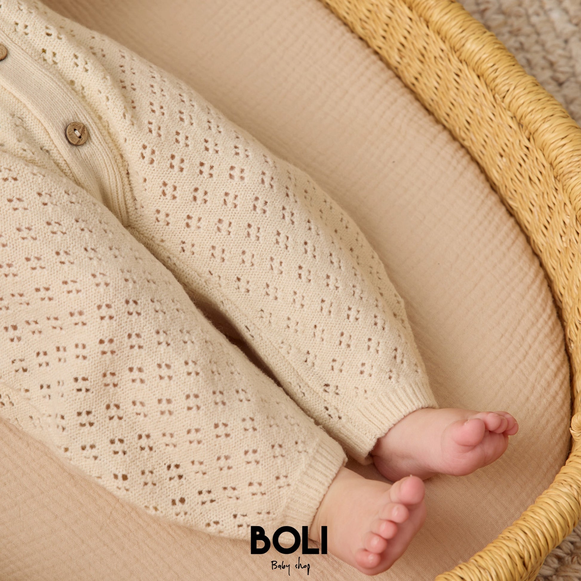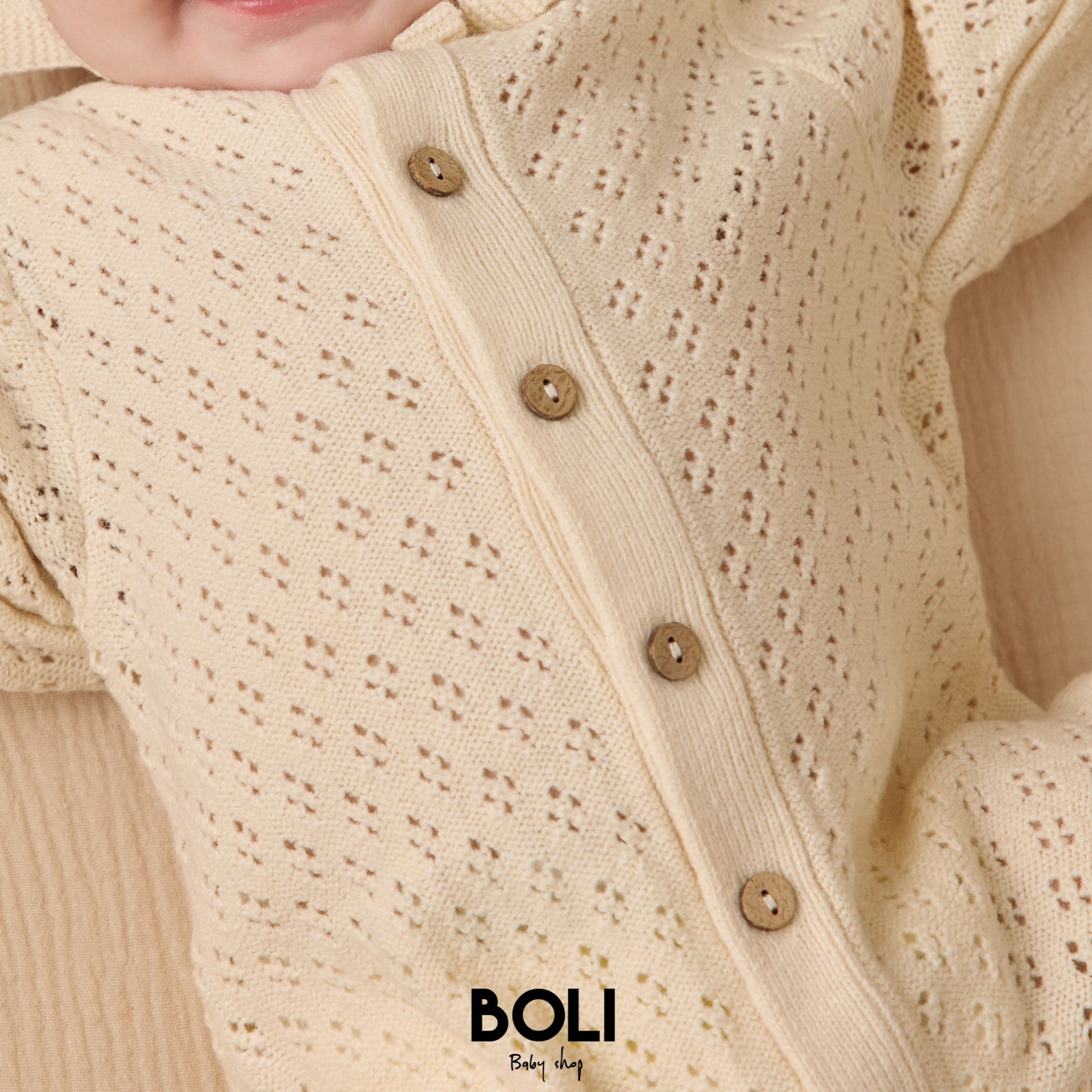 Este pelele de manga larga, confeccionado en suave tela de punta, cuenta con botones delanteros de coco y una preciosa silueta de burbuja.