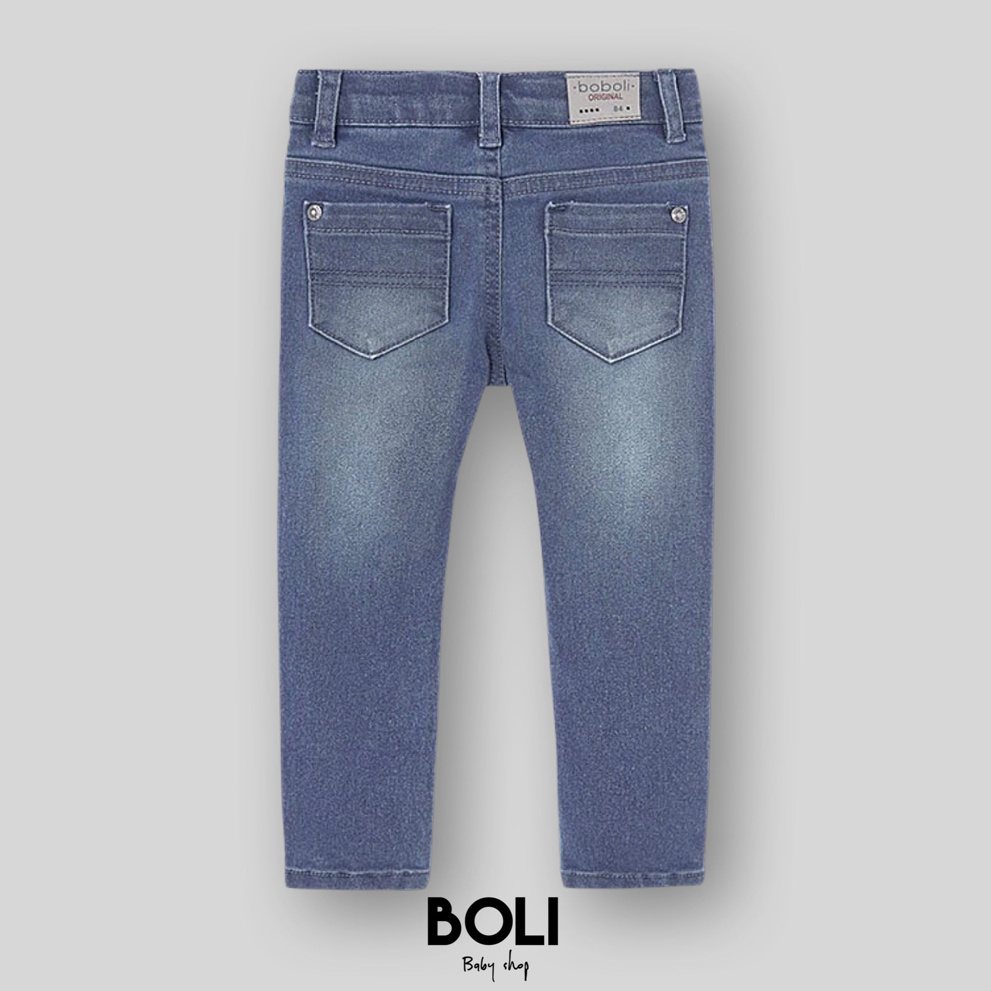 Pantalón tejano elástico de niño en color gris, se abrocha con cierre a presión, la cintura se ajusta con goma de ojales y botón interior. La decoración es una etiqueta con detalle de la marca.
