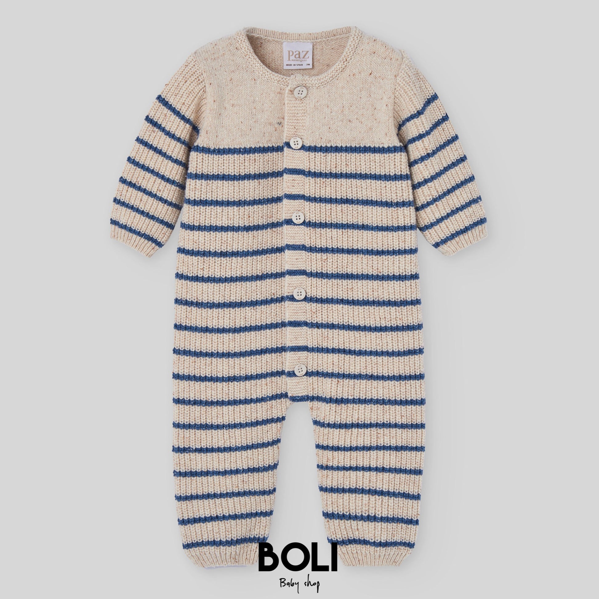 Pelele en punto color angora y marino, a rayas. Sin pie. Botones delanteros.