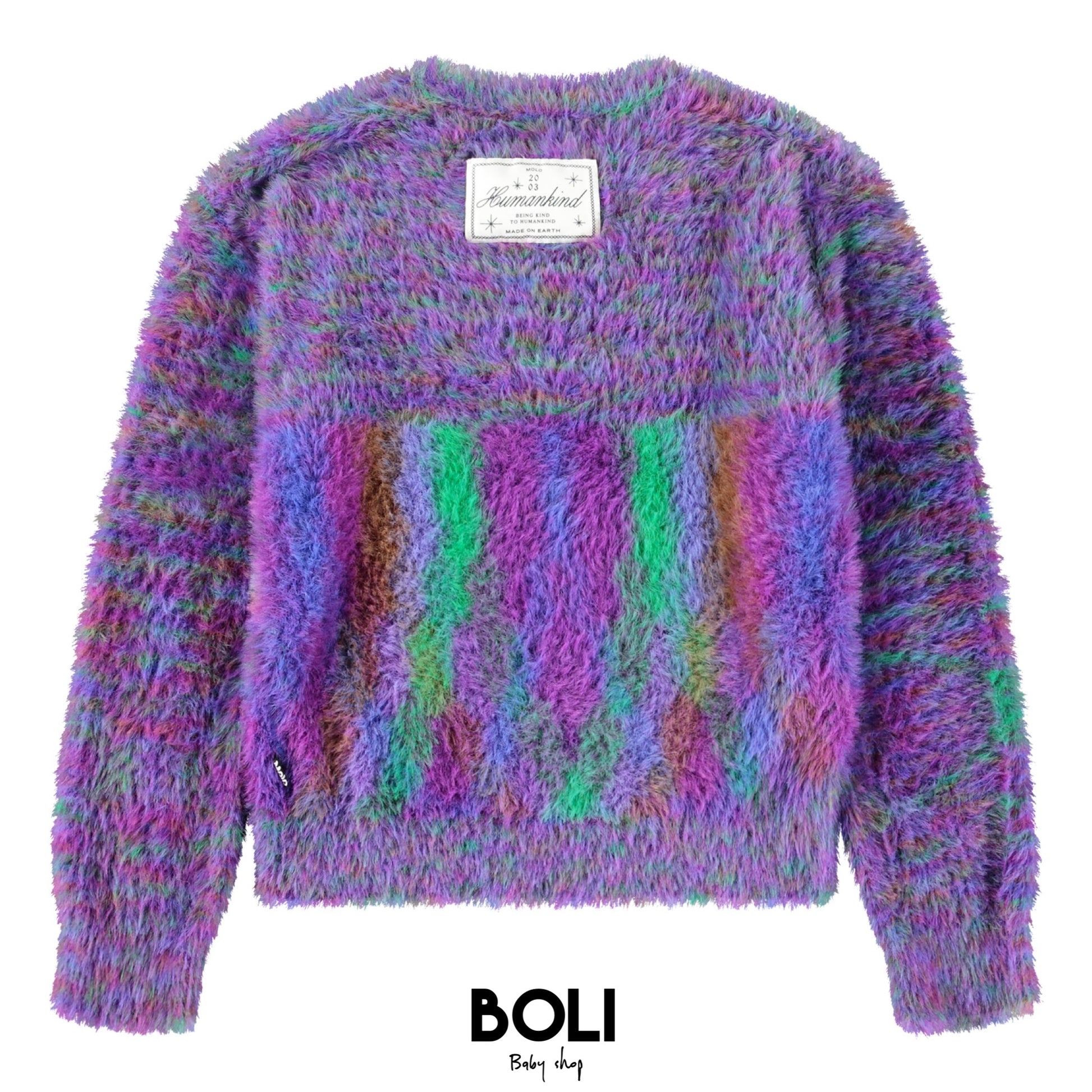 Suéter esponjoso multicolor hecho de piel sintética. El suéter tiene bordes acanalados alrededor del cuello, las mangas y la cintura, así como una bonita etiqueta con el texto "Humankind - Being Kind to Humankind" en la parte posterior.