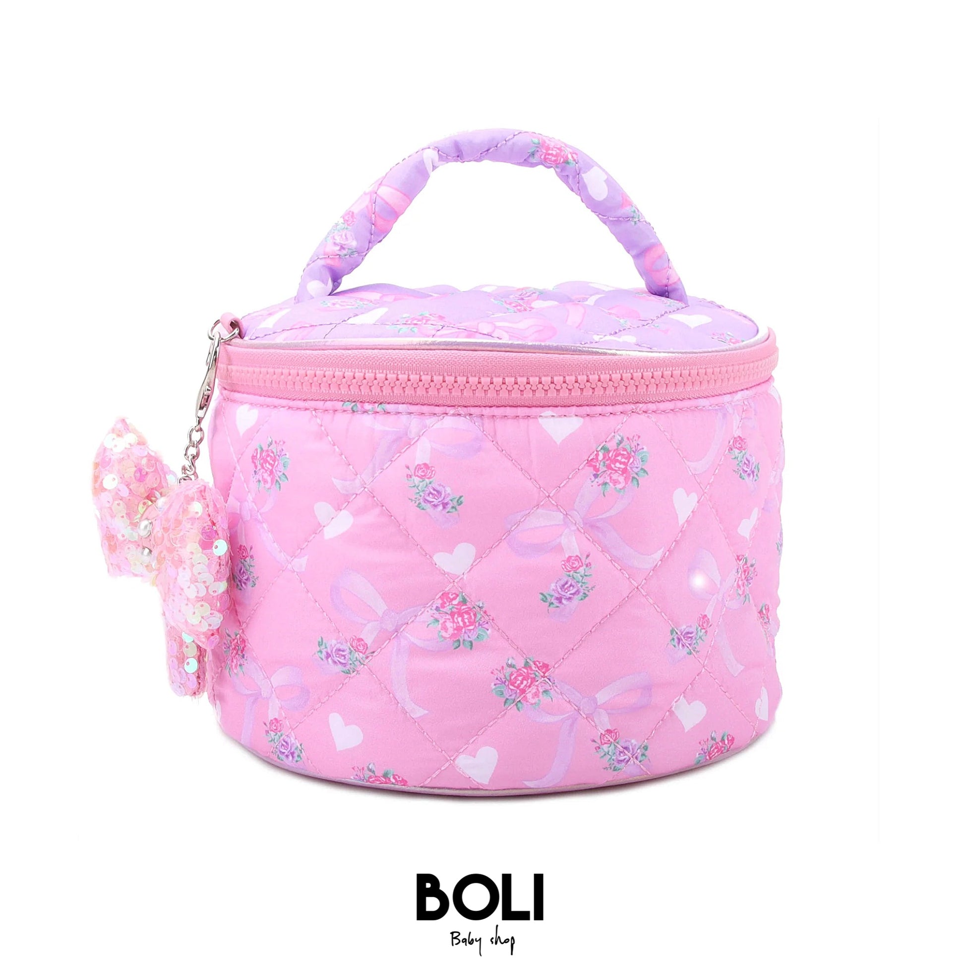 ¡Haz que cada momento glamuroso sea dulce con nuestra nueva bolsa redonda de tren en nuestros estampados florales y de lazo rosa y morado! Detallado con un dije de bolsa de corazón de cristal rosa, ¡este elemento esencial de almacenamiento es imprescindible para cualquier amante del maquillaje!