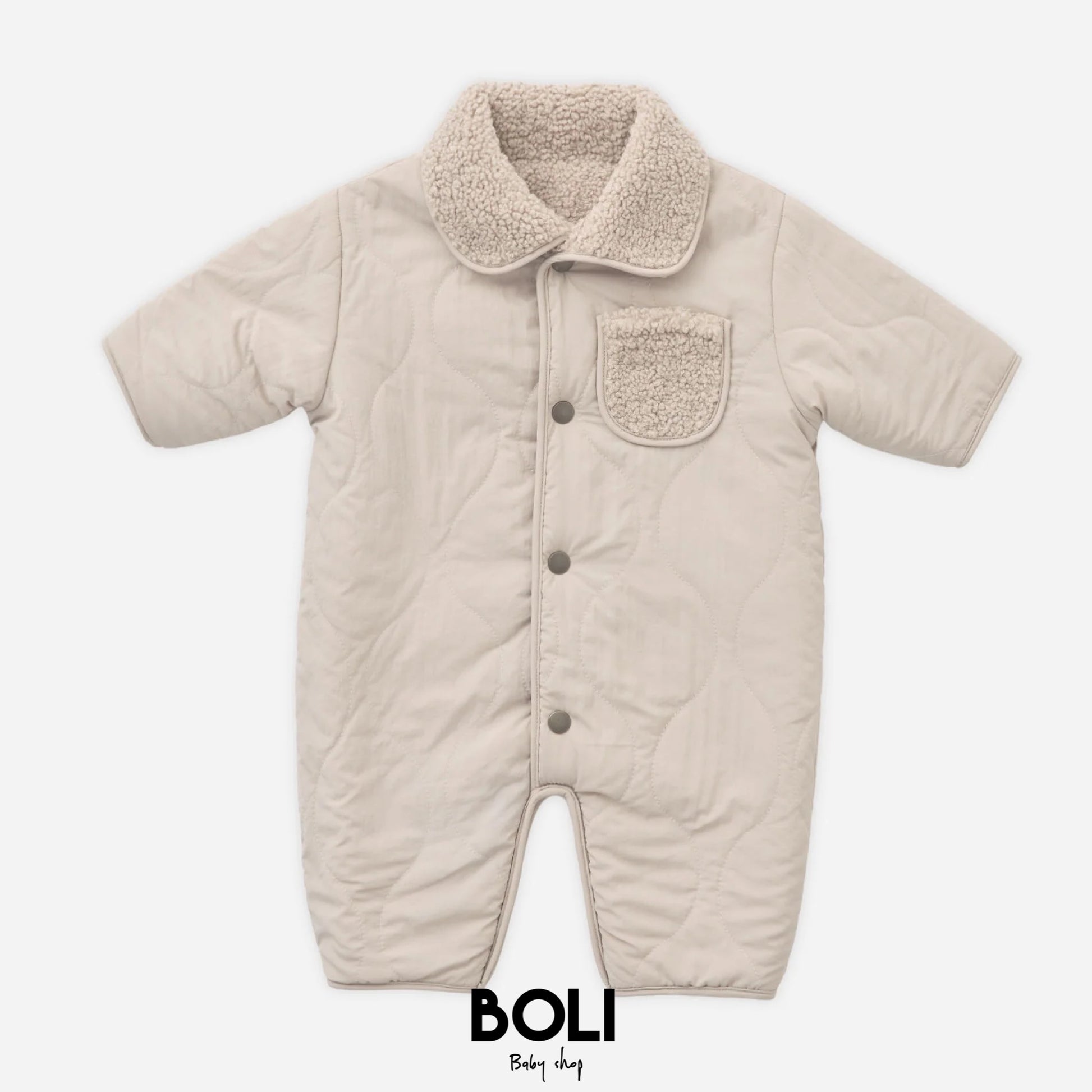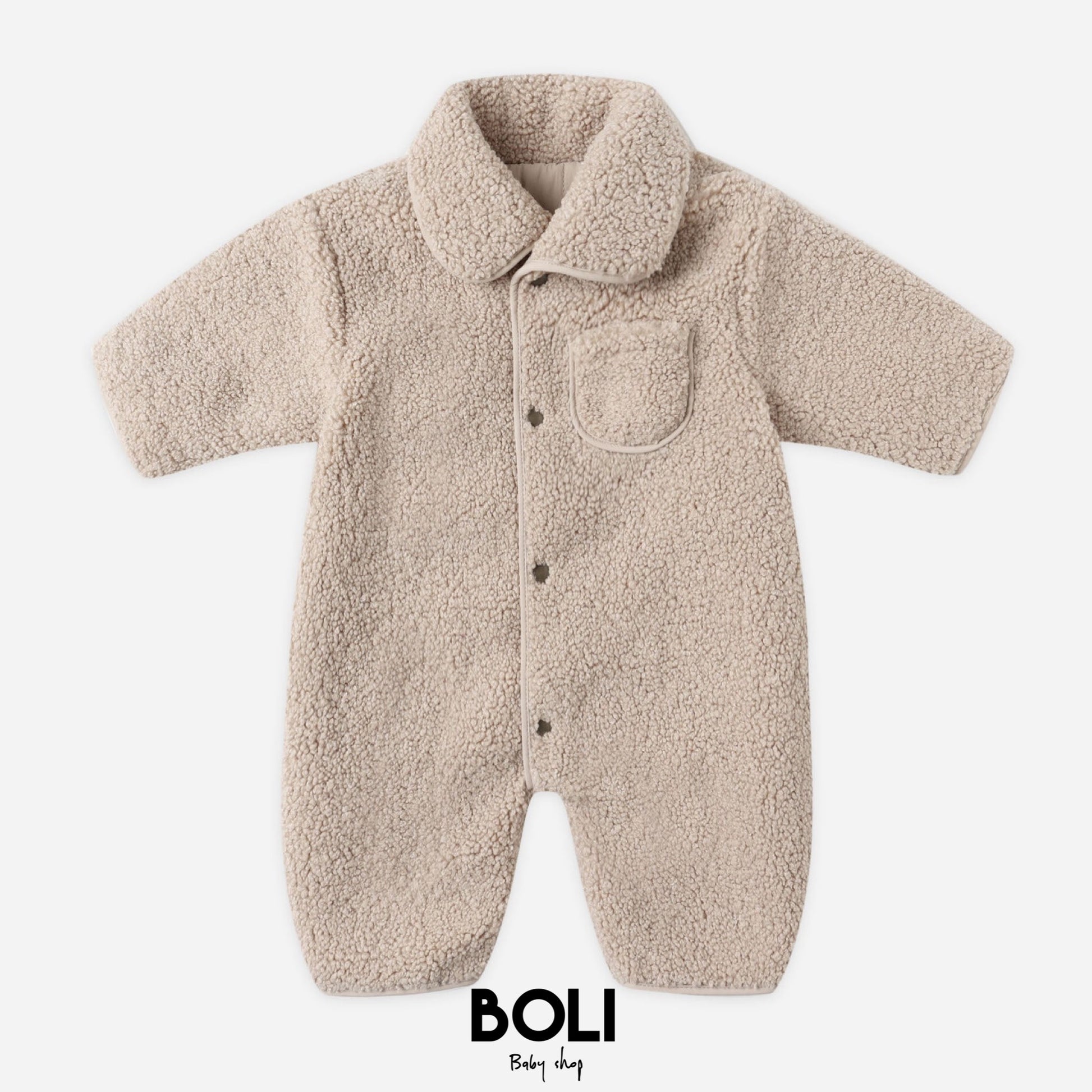 Este mono reversible de piel de oveja incluye botones a presión en la parte delantera para facilitar la combinación, ribetes en contraste y un pequeño bolsillo en el pecho, perfecto para mantener a tu pequeño abrigado con estilo.