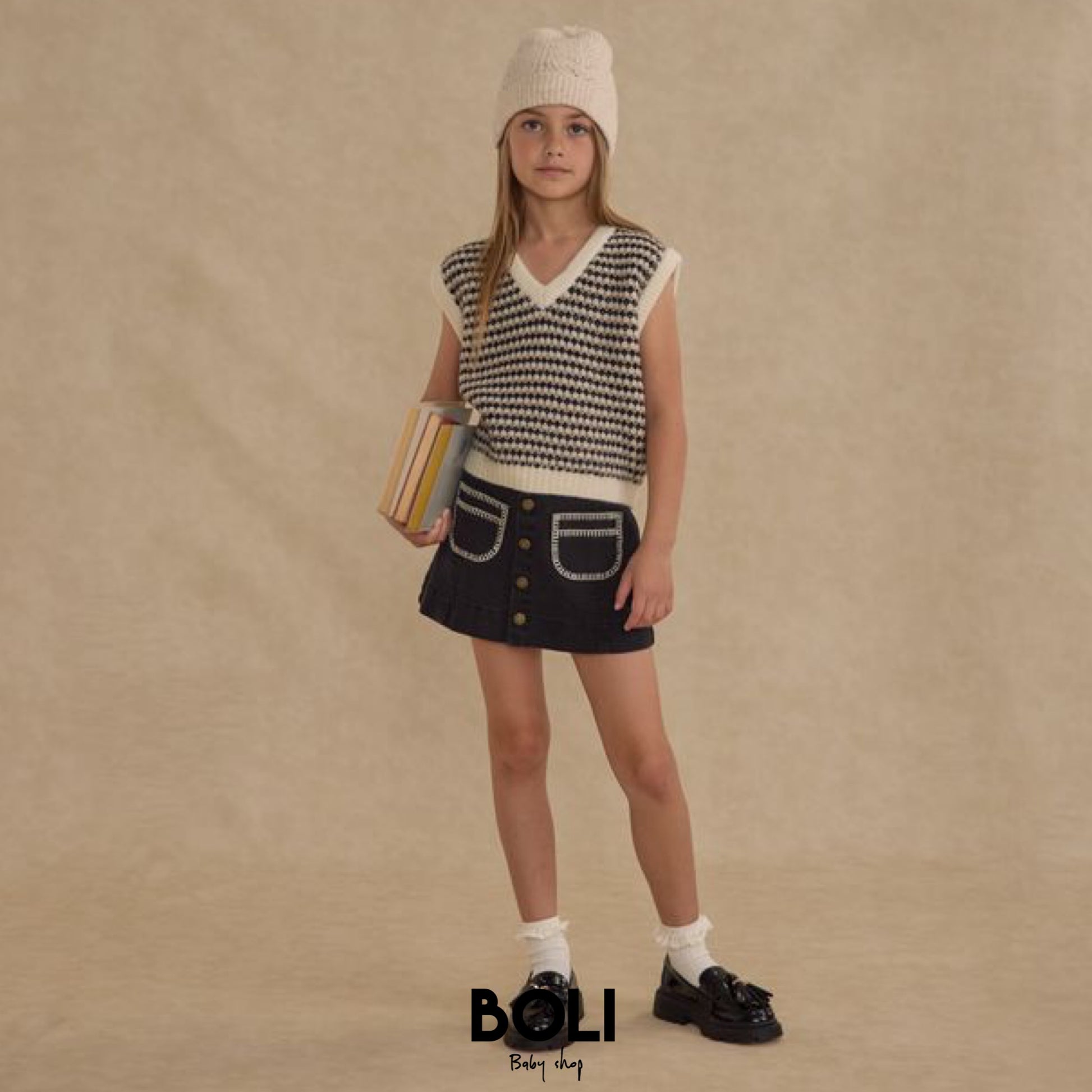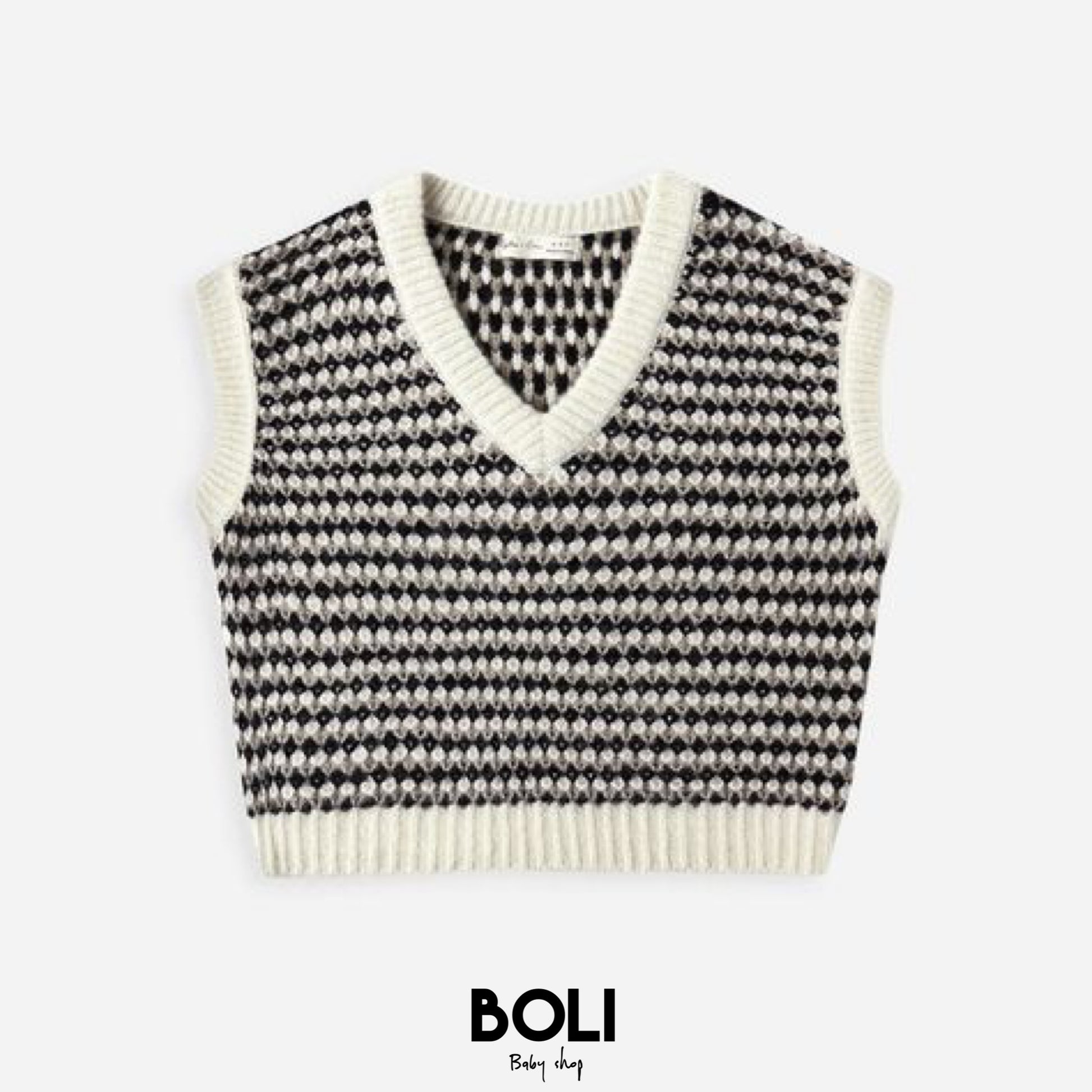 Este chaleco de suéter de ajuste cuadrado presenta un clásico escrito en V, hombros caídos y molduras acanaladas en los dobladillos para un aspecto vintage.