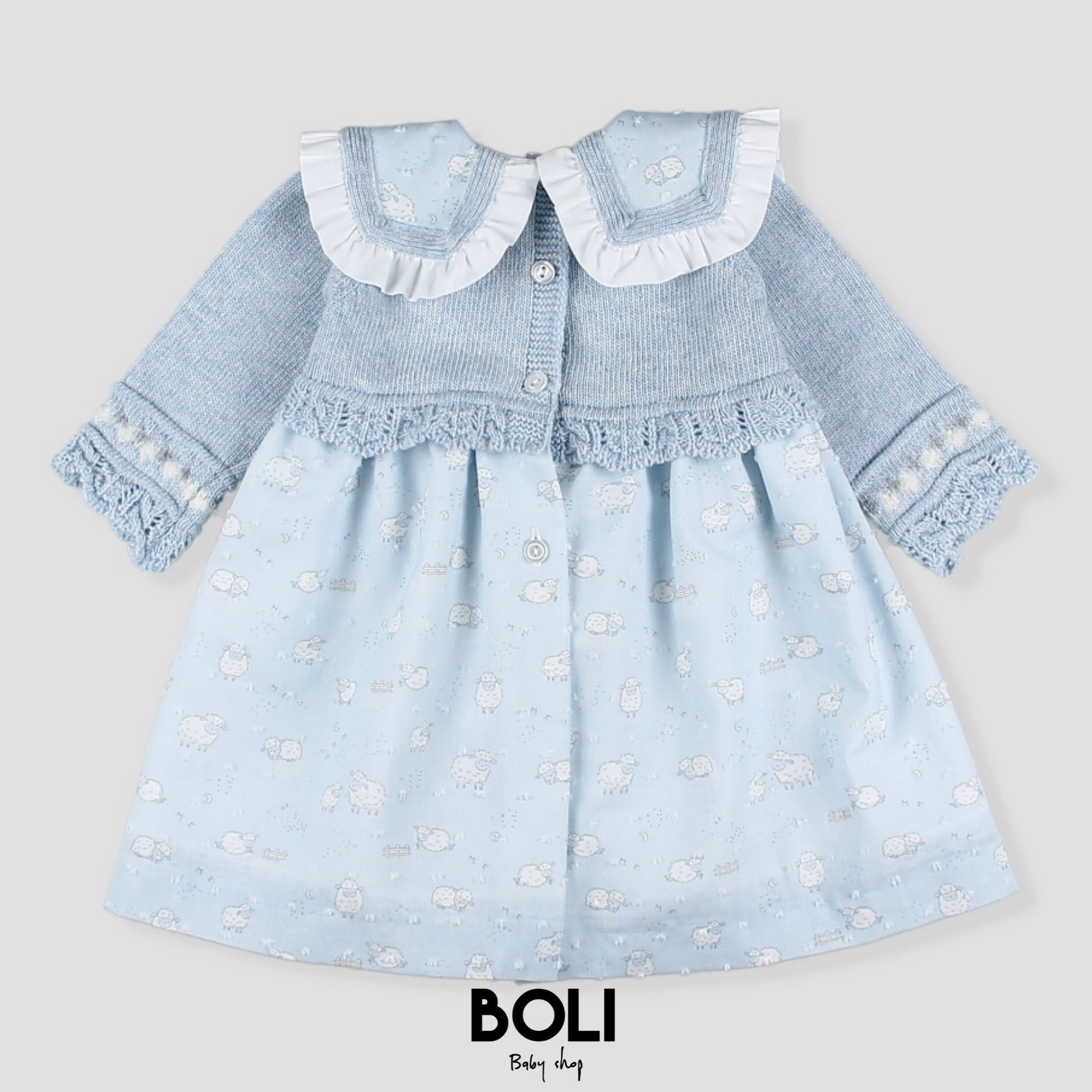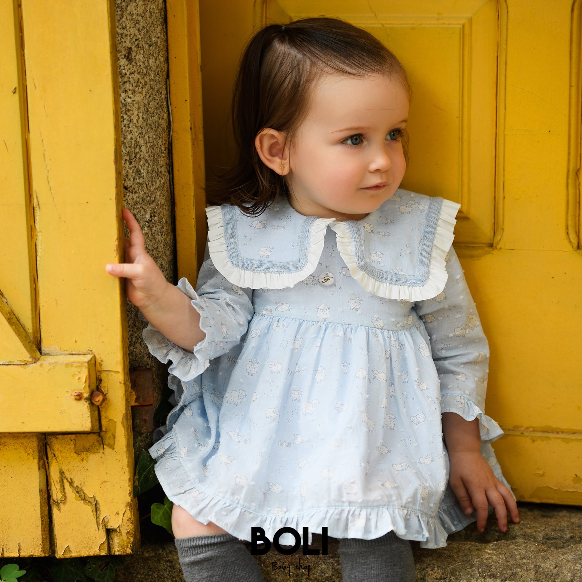 Este encantador vestido para bebé niña incluye un vestido con manga larga y braguita a juego, ambos confeccionados en un tejido ligero azul con un delicado estampado de ovejitas. El maxi cuello cuadrado con volante blanco y remate en punto celeste aporta un toque dulce, los frunces y volantes en puños y bajo realzan su movimiento. Un diseño versátil, pensado para ofrecer comodidad sin perder estilo.