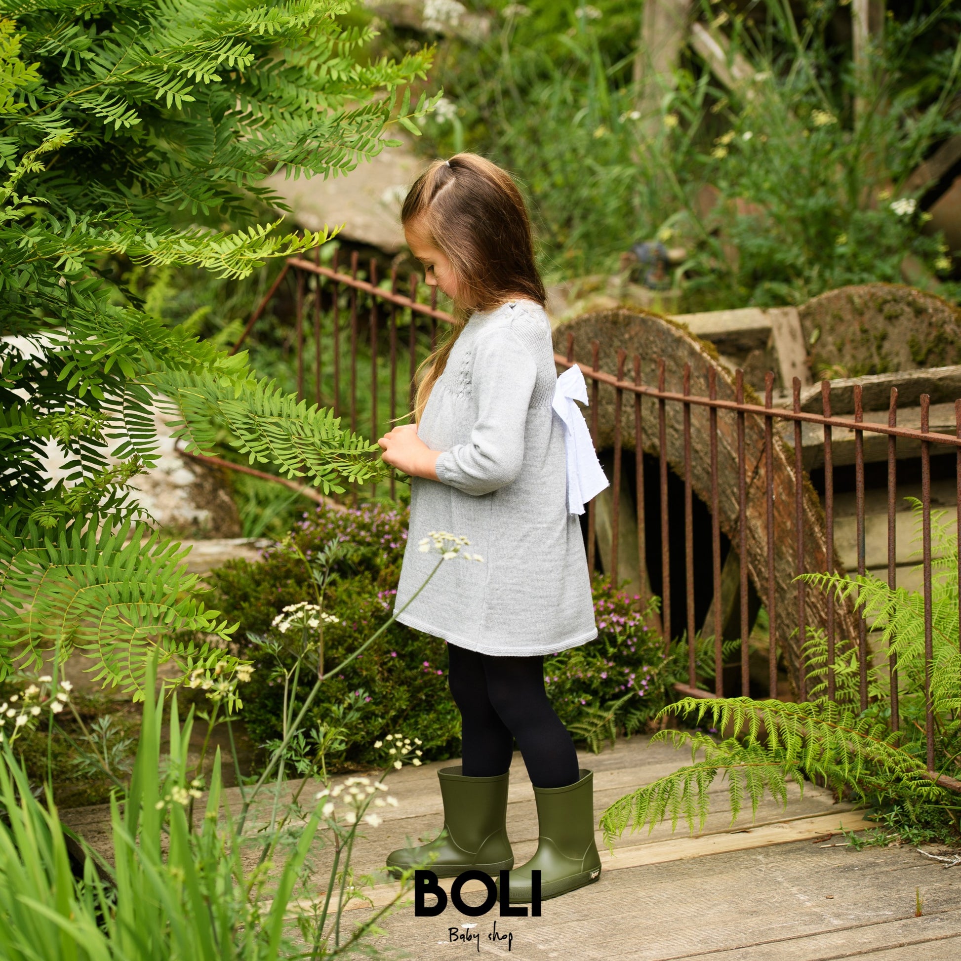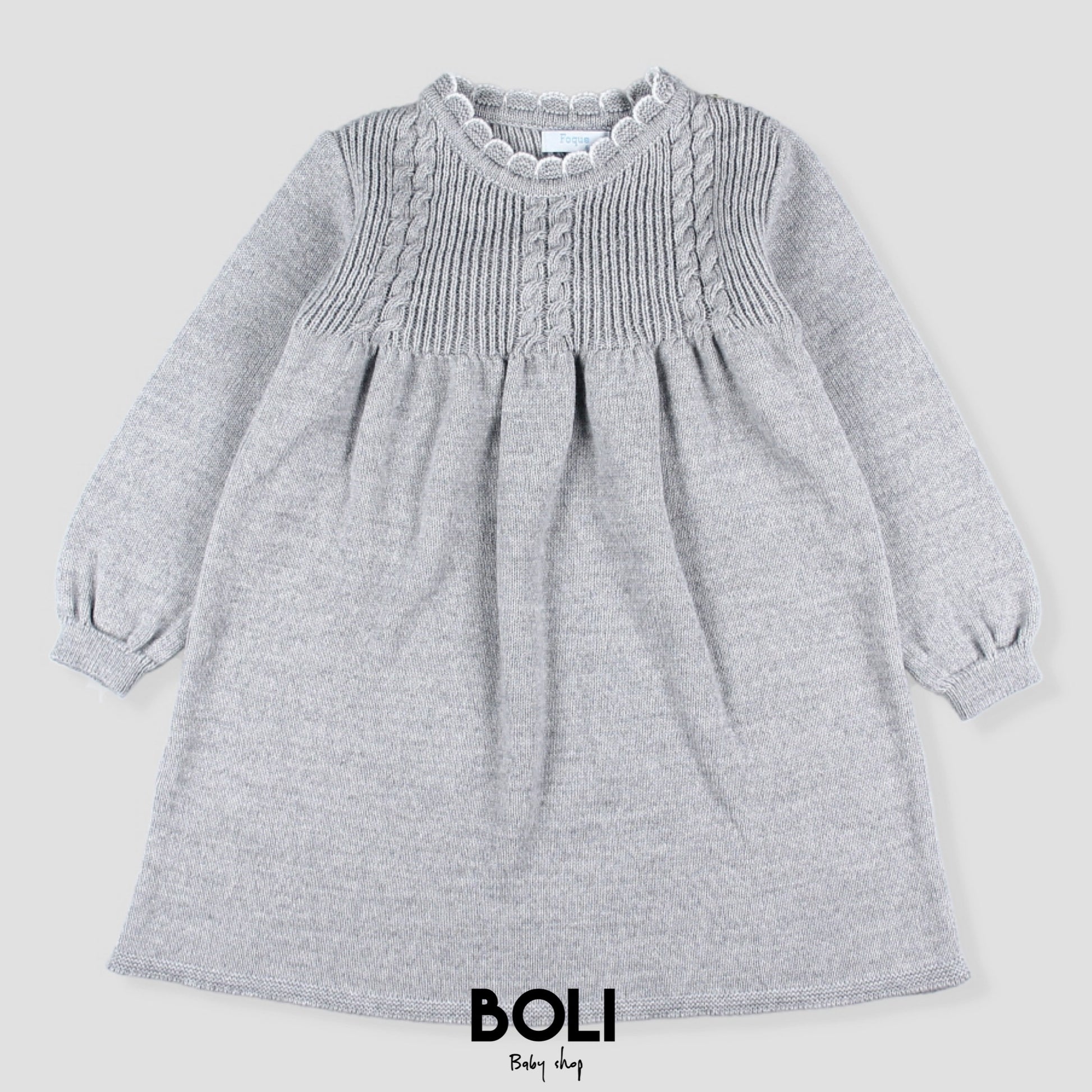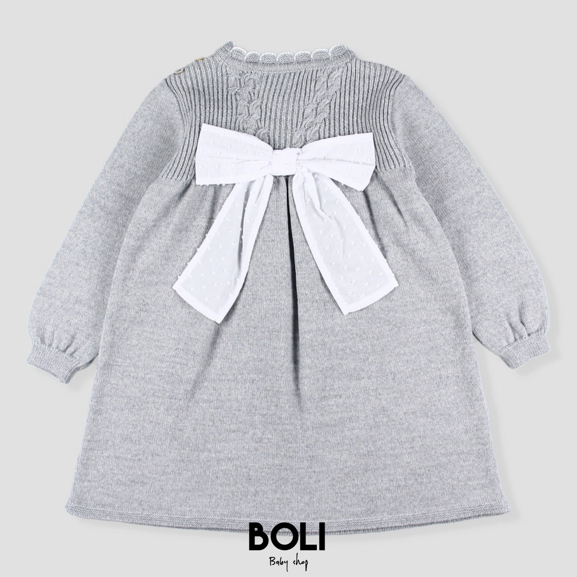 Vestido de punto cadena en gris. Detalle de lazo atras.