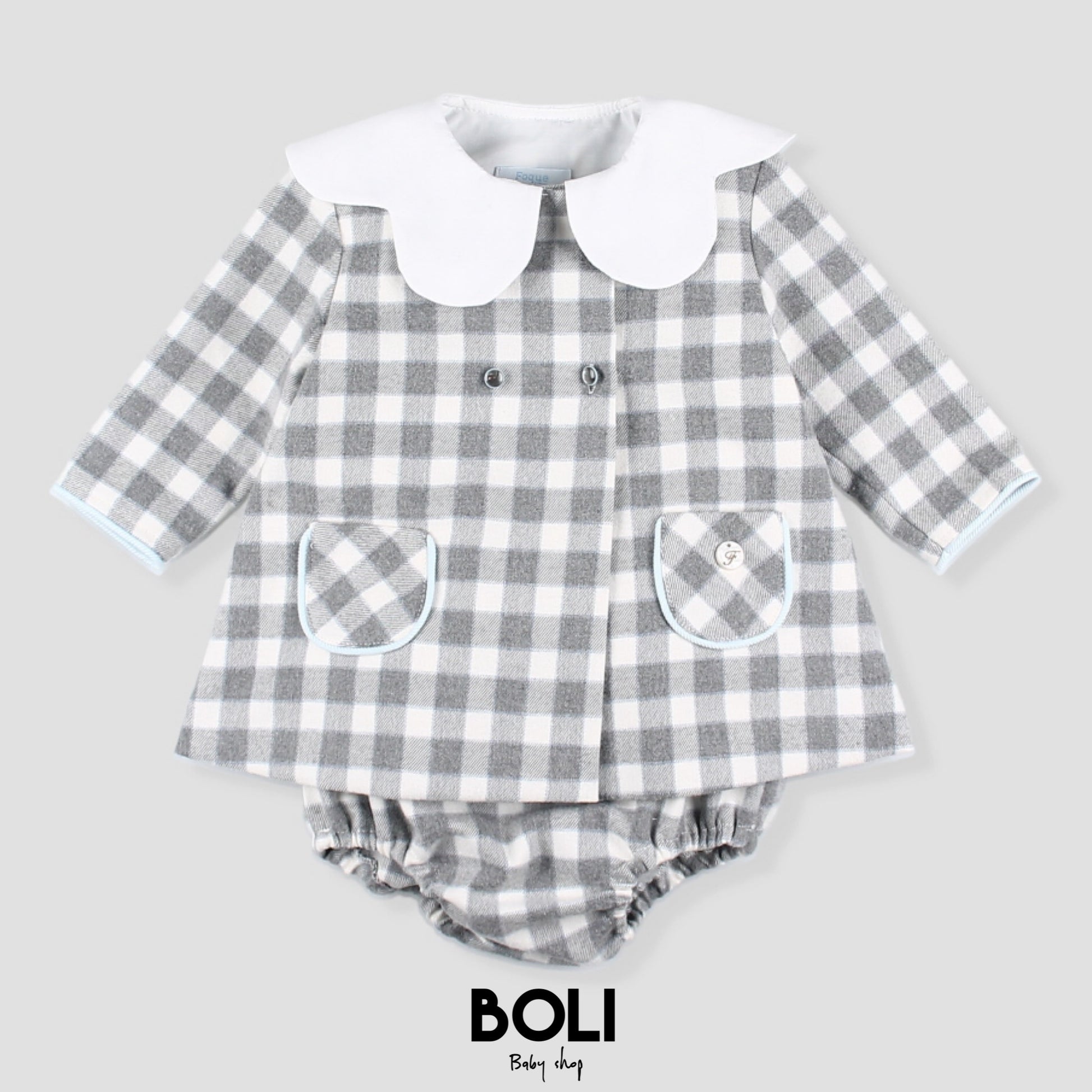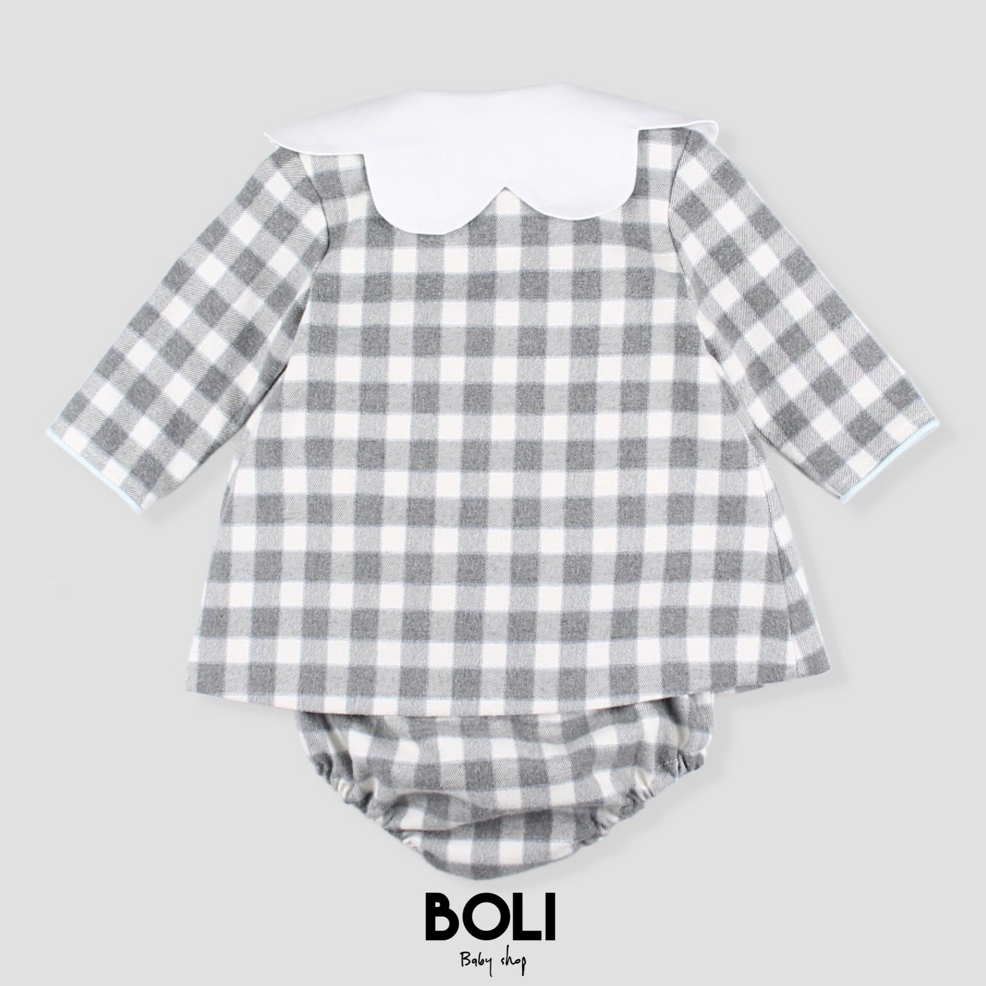Vestido de cuadros gris y celeste, adornado con un simpático cuello y bolsillos al frente, diseño exclusivo de Foque. Tonos grises y azules que crean un look actual, dulce y divertido, perfecto para el día a día o para una ocasión especial. Hecho en España.
